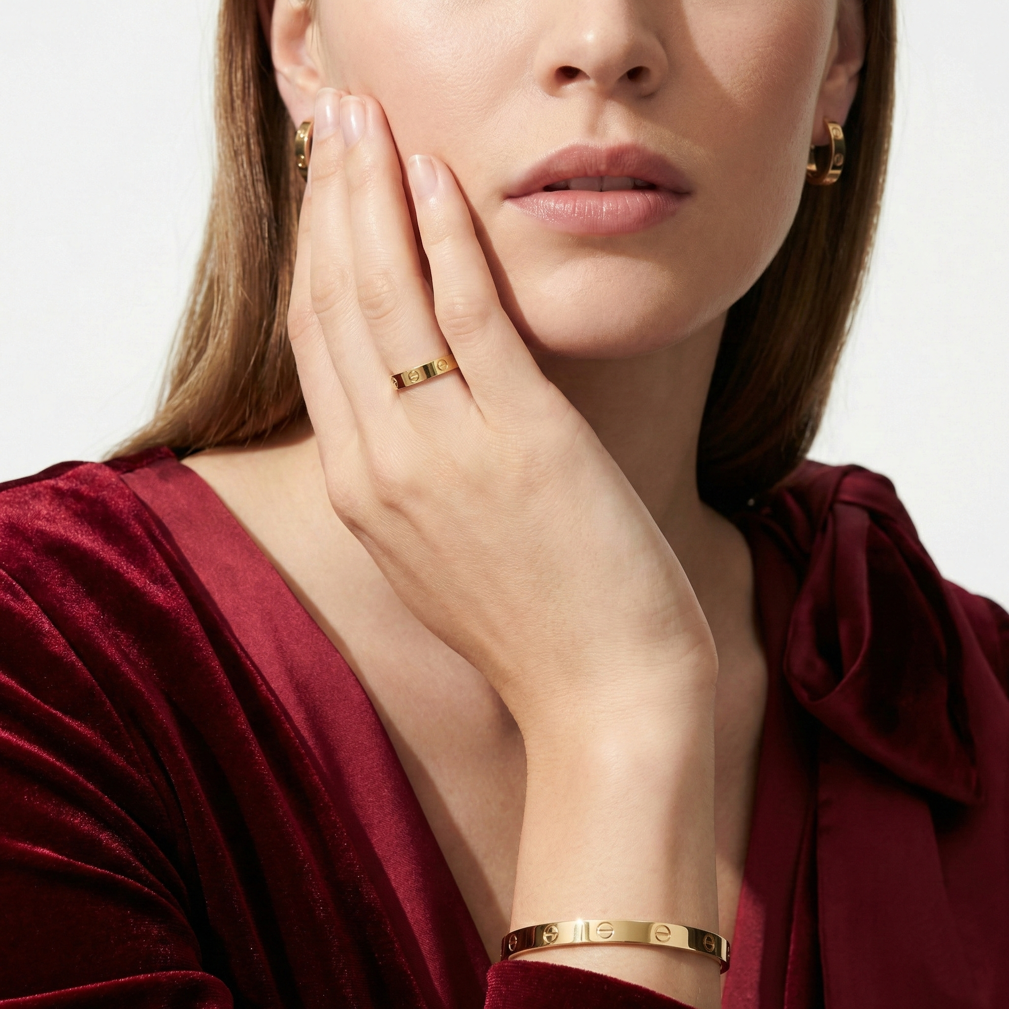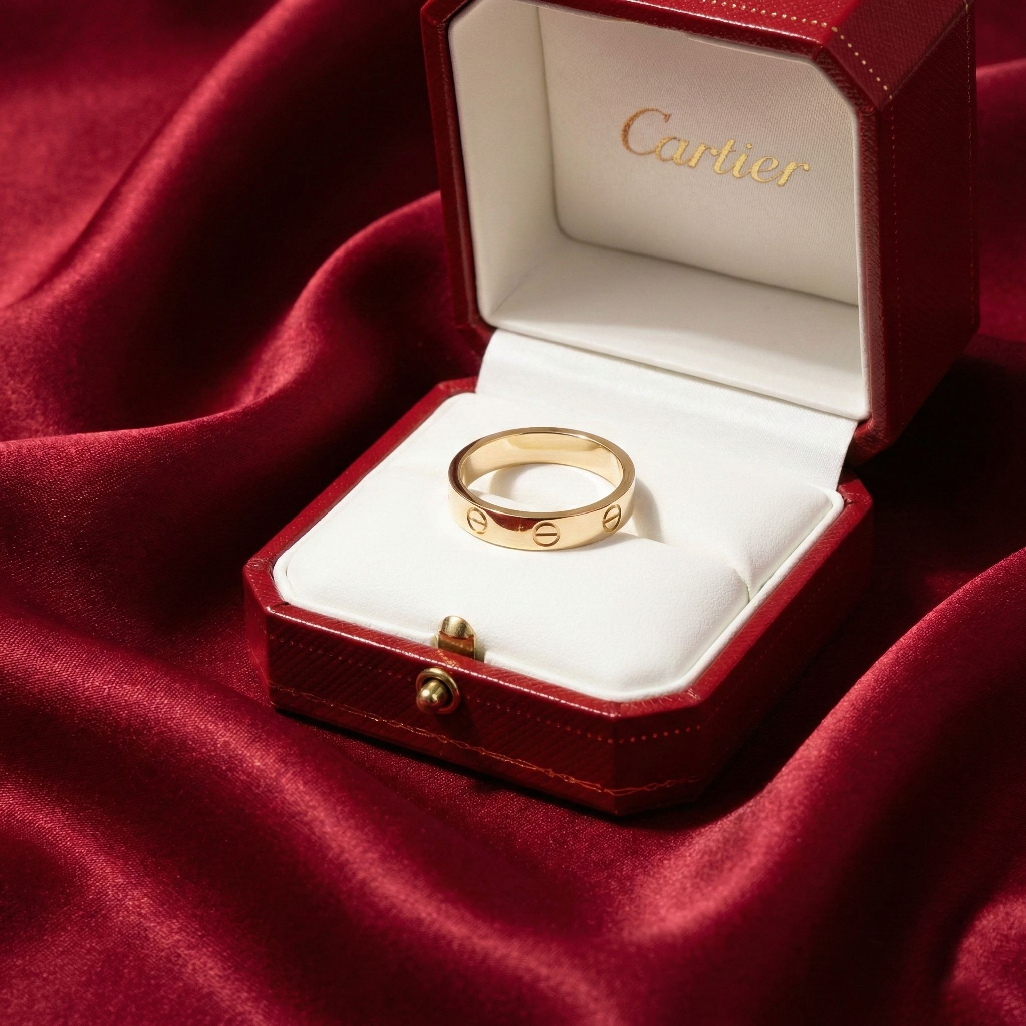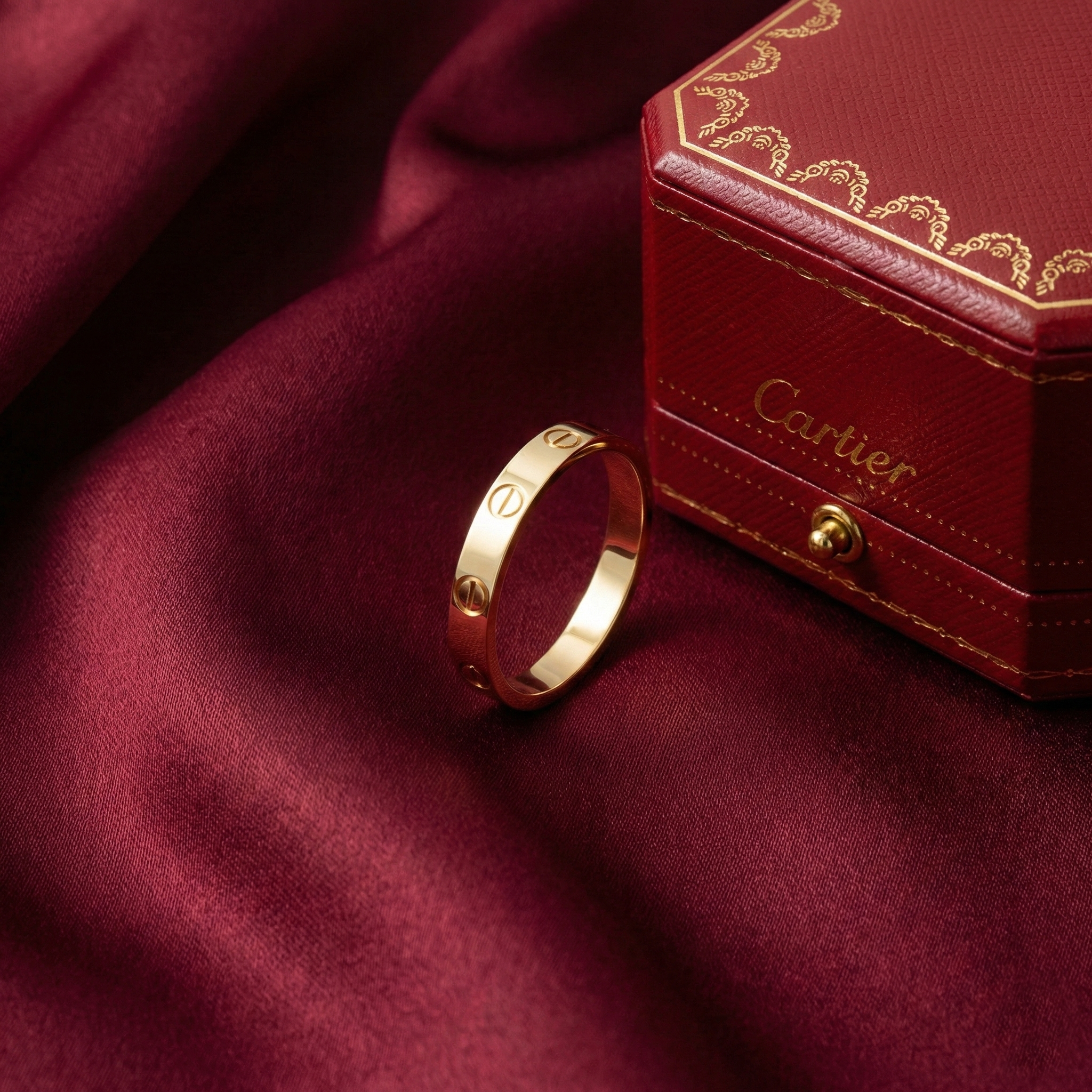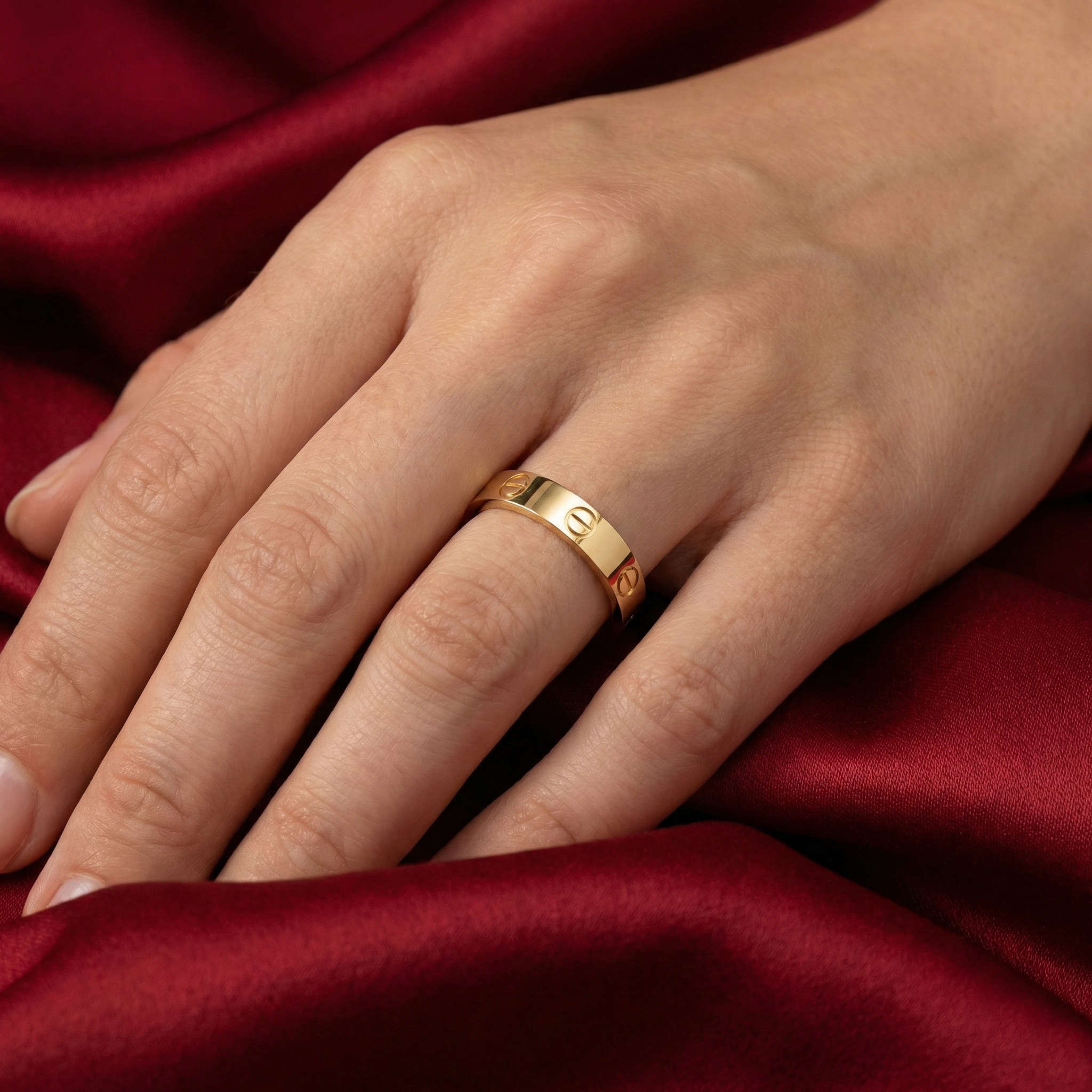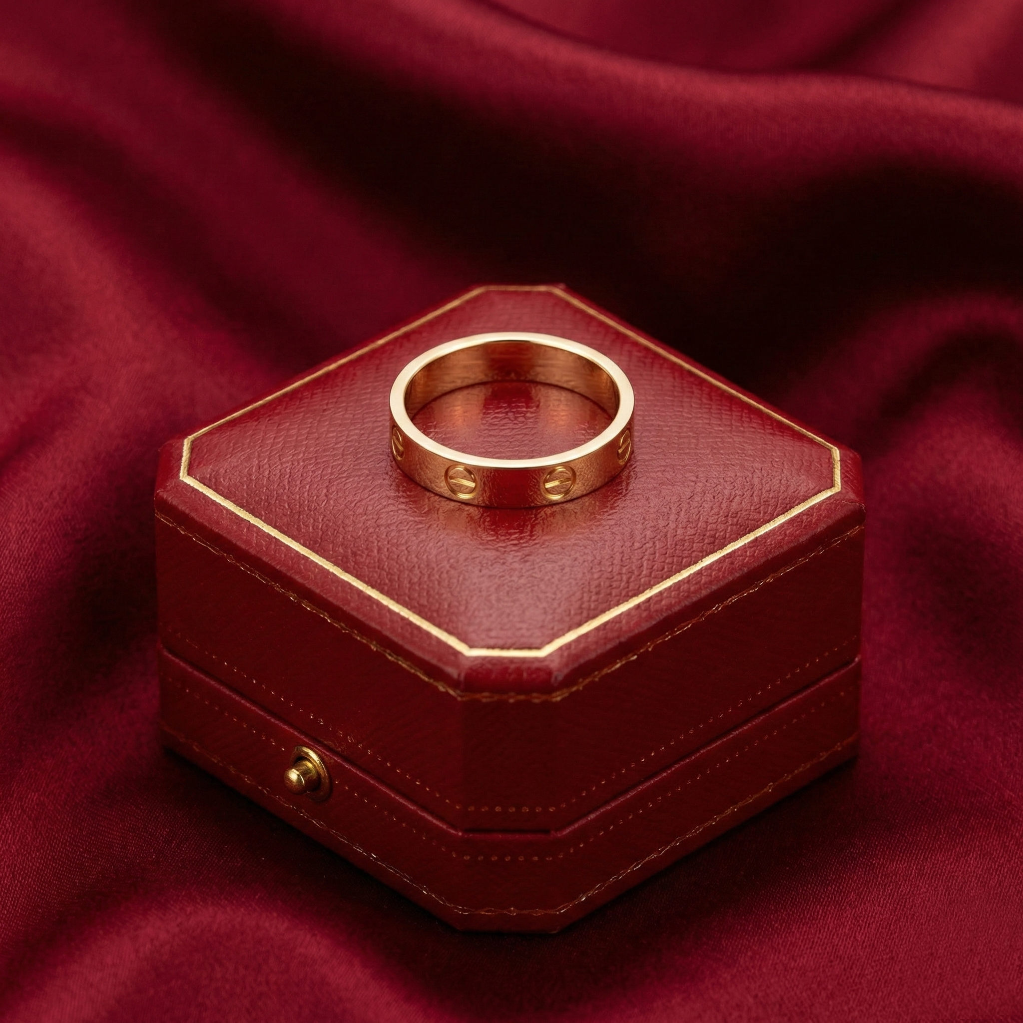 The Cartier’s, LOVE Ring Small Model, Gold Filled masterfully blends bold design with enduring elegance. The distinctive screw motifs and ideal oval shape establish this creation as a timeless tribute to romance.