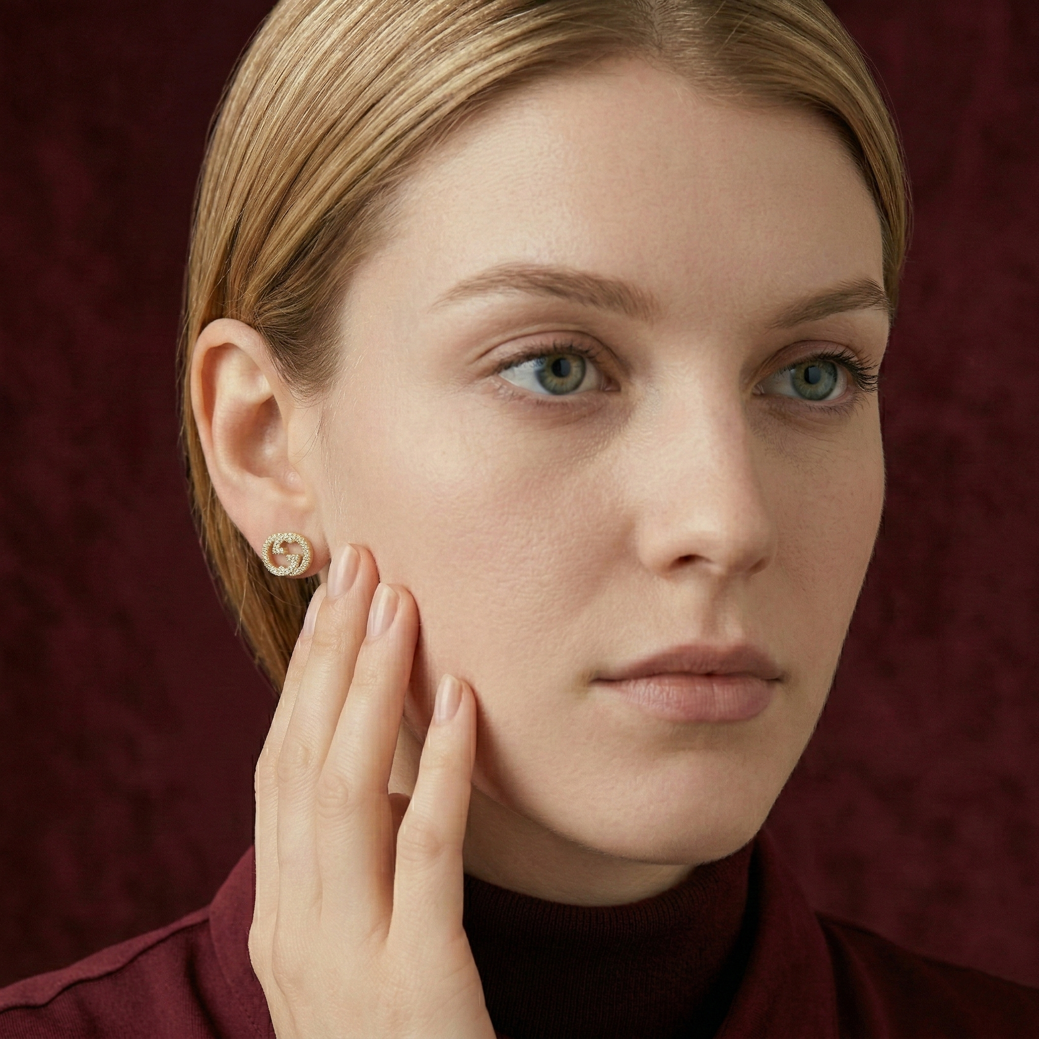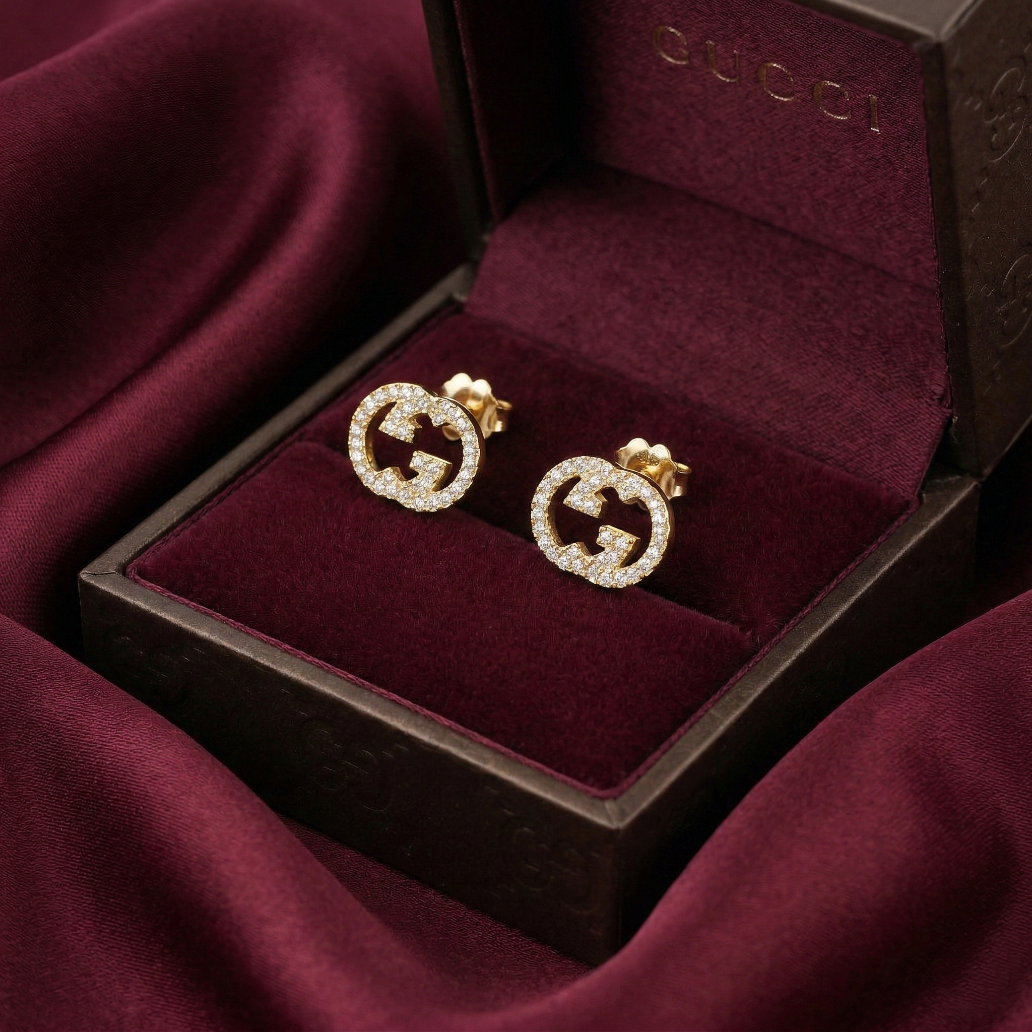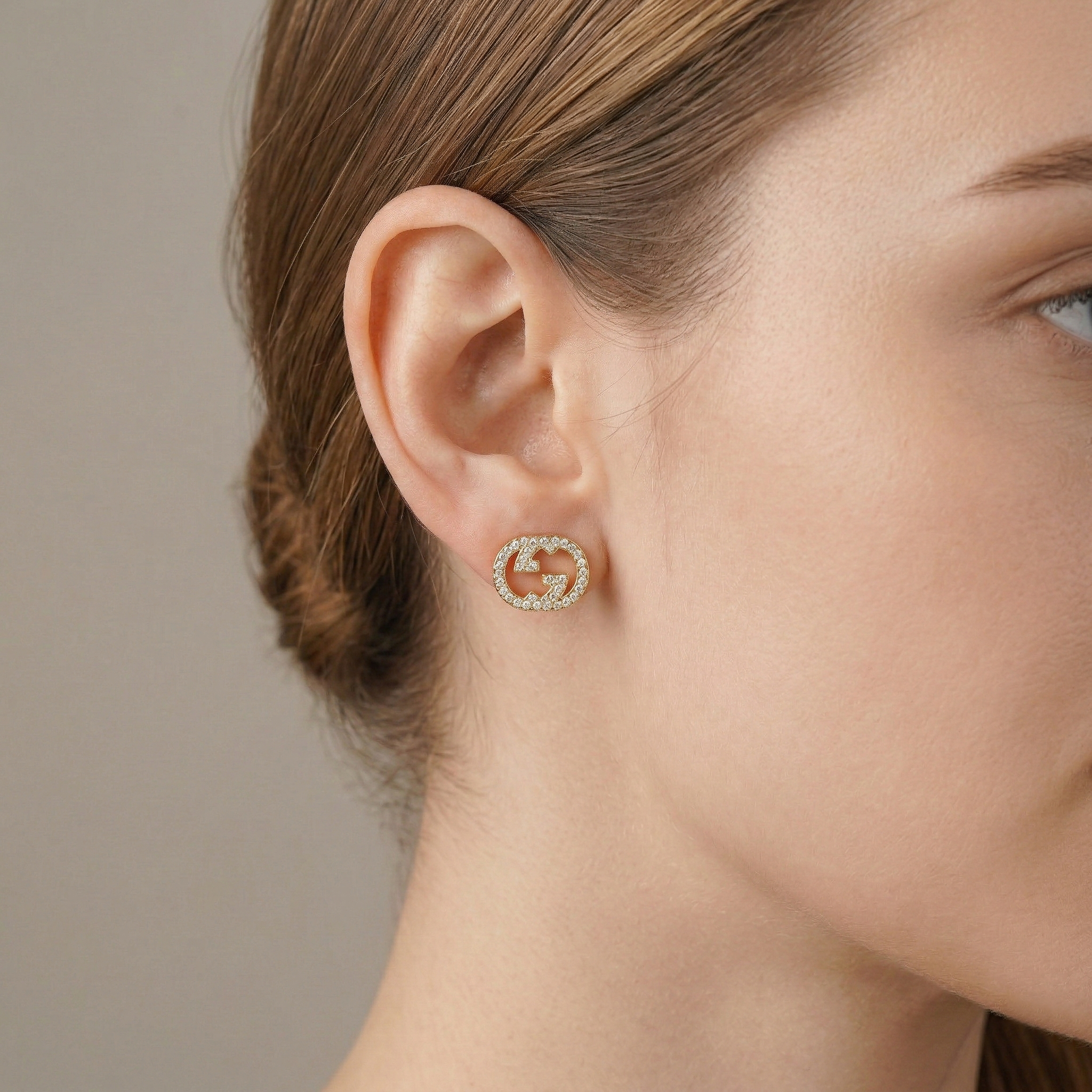 This pair of earrings belongs to the Interlocking jewelry collection, inspired by geometric logo designs. The earrings feature a stylized GG logo motif, elegantly embellished with sparkling cubic zirconia stones, creating a modern and sophisticated beauty.