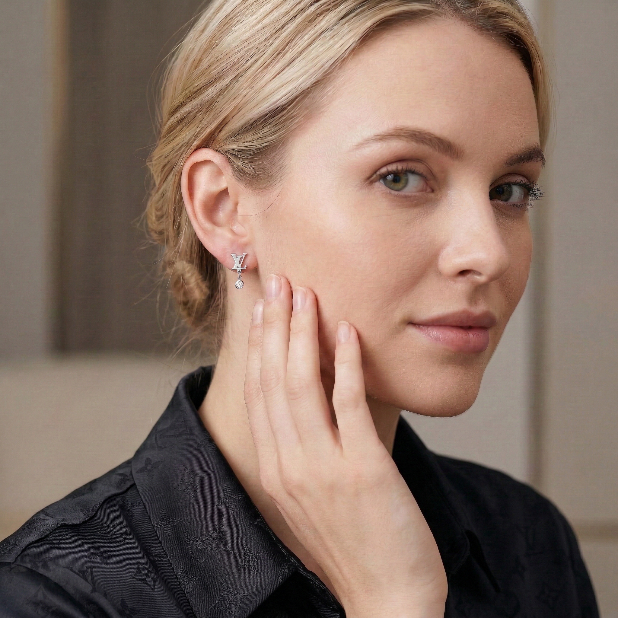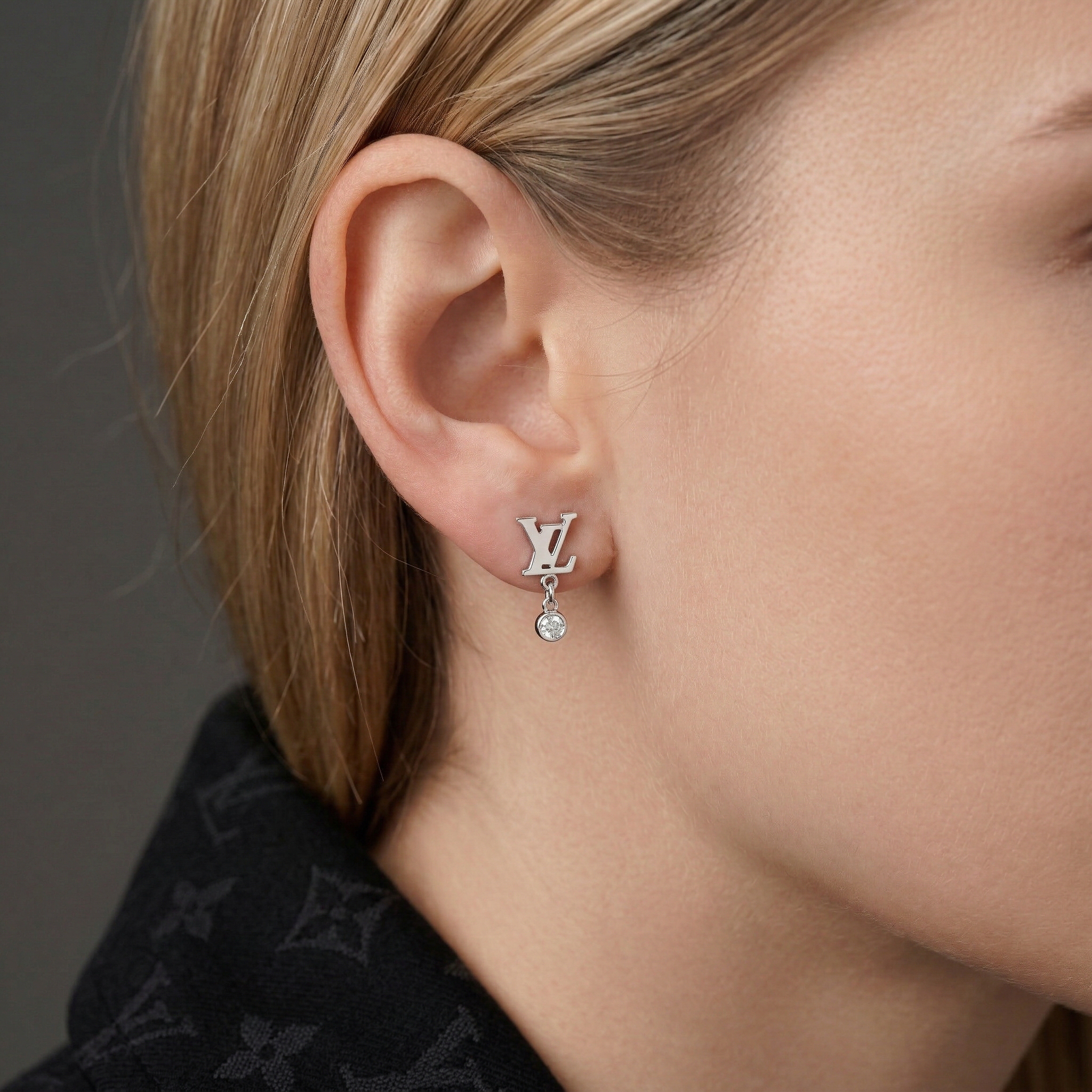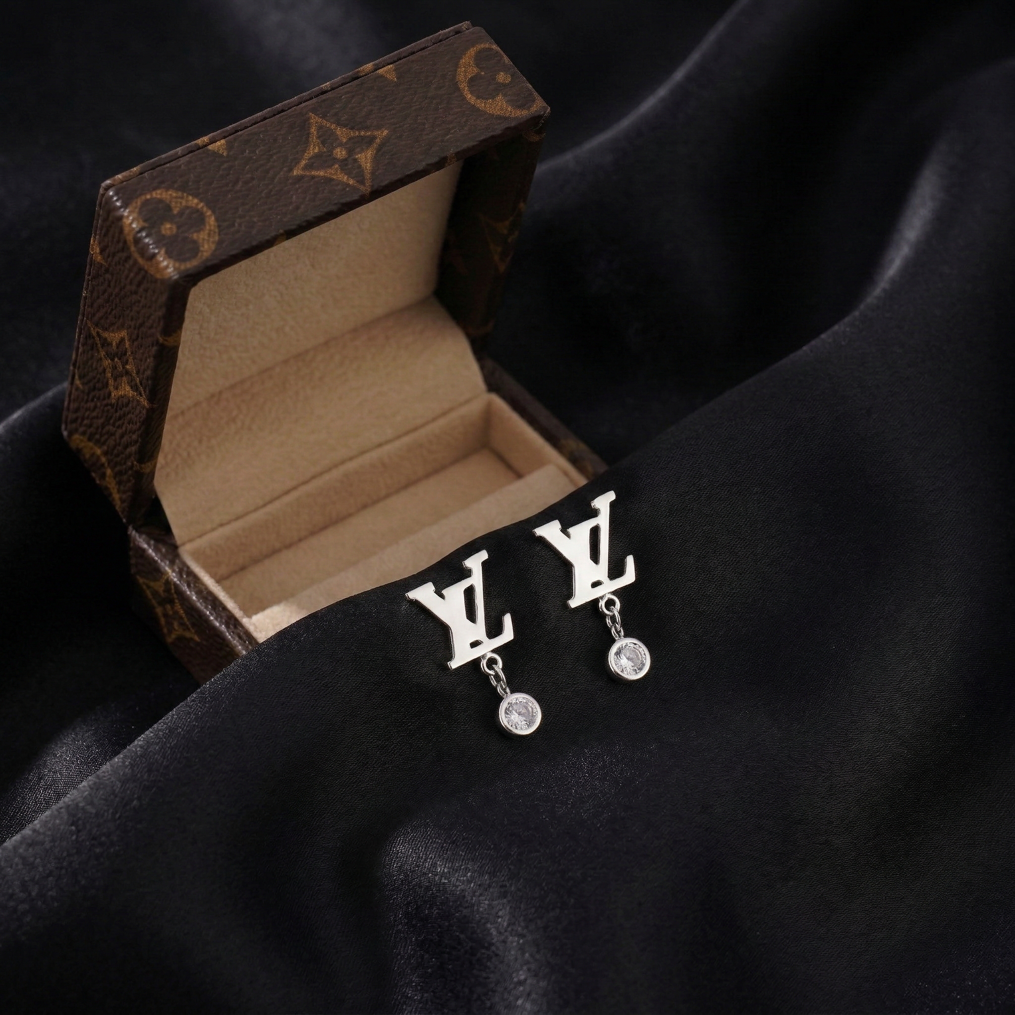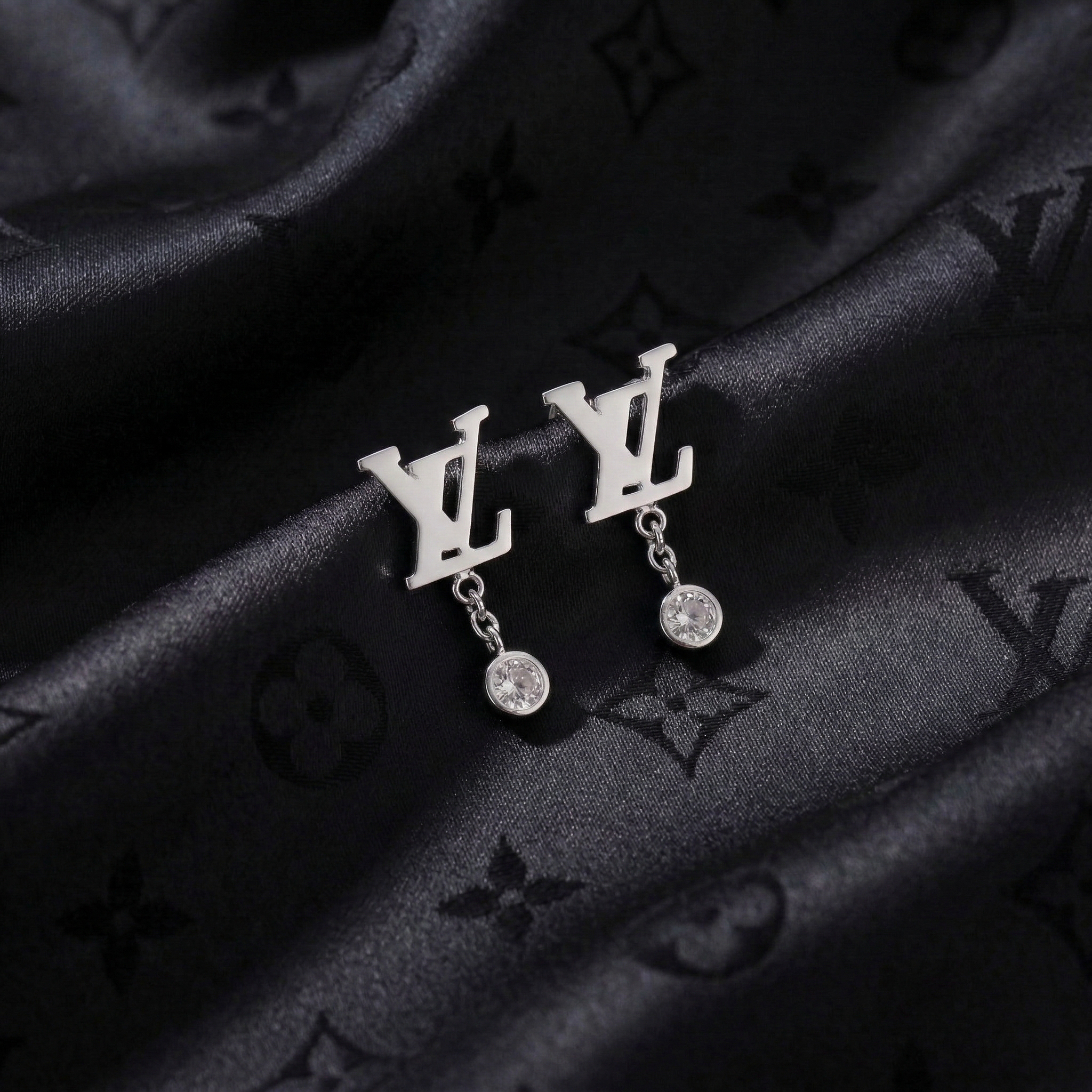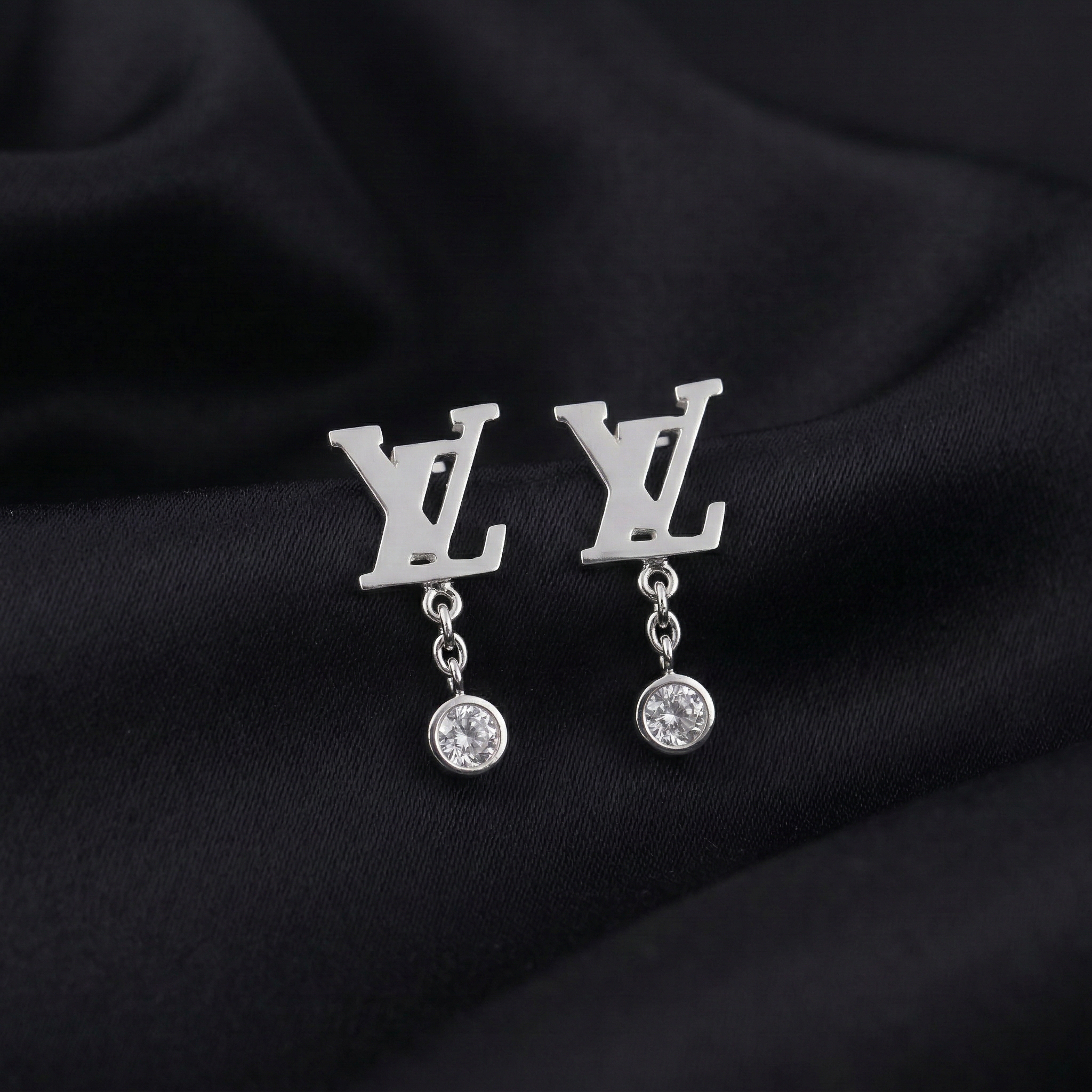 This elegant and captivating earring design, inspired by high-end fashion, features a sharp, stylized L.V. emblem. It’s gracefully combined with a sparkling Cubic Zirconia stone that hangs delicately, creating gentle movement with every step you take.