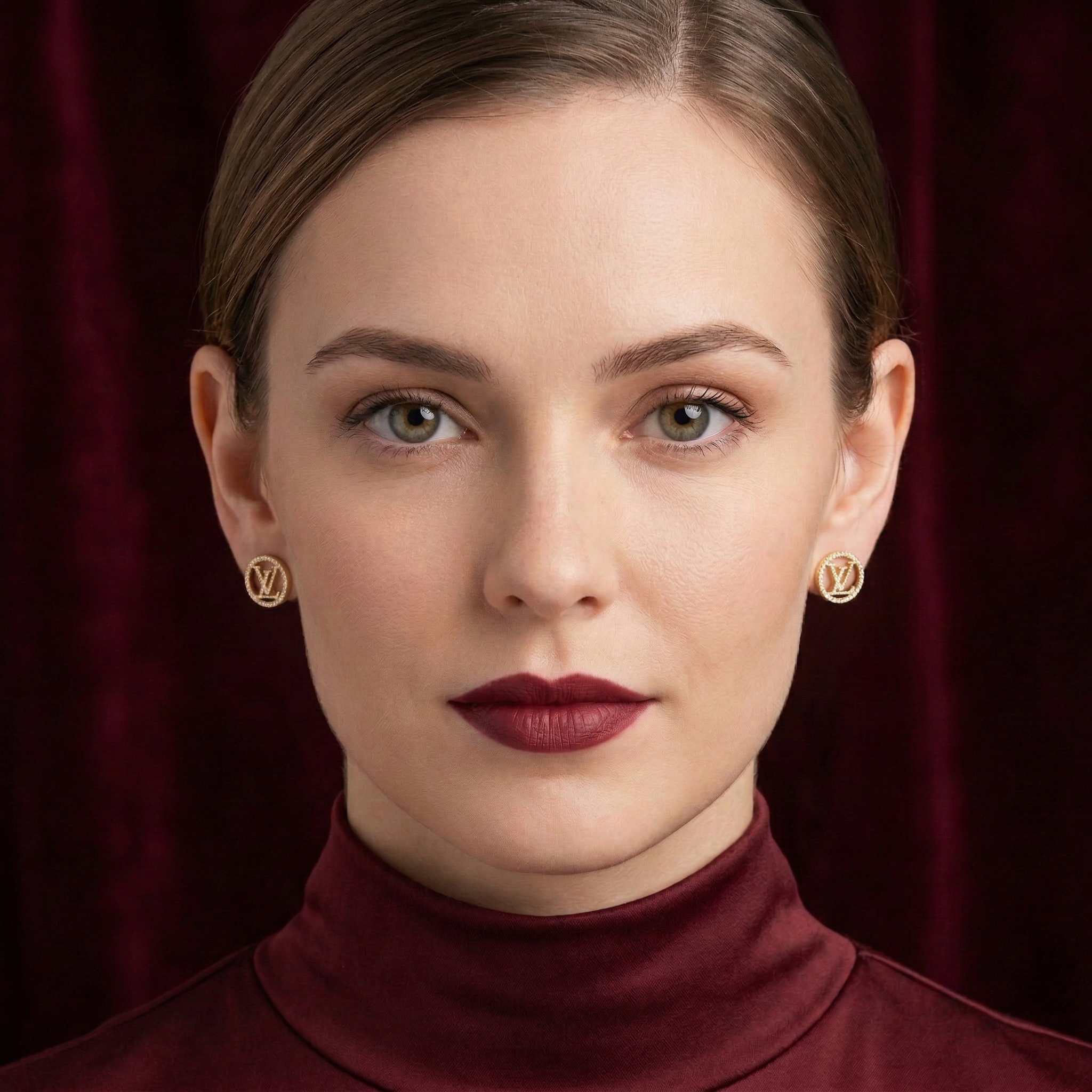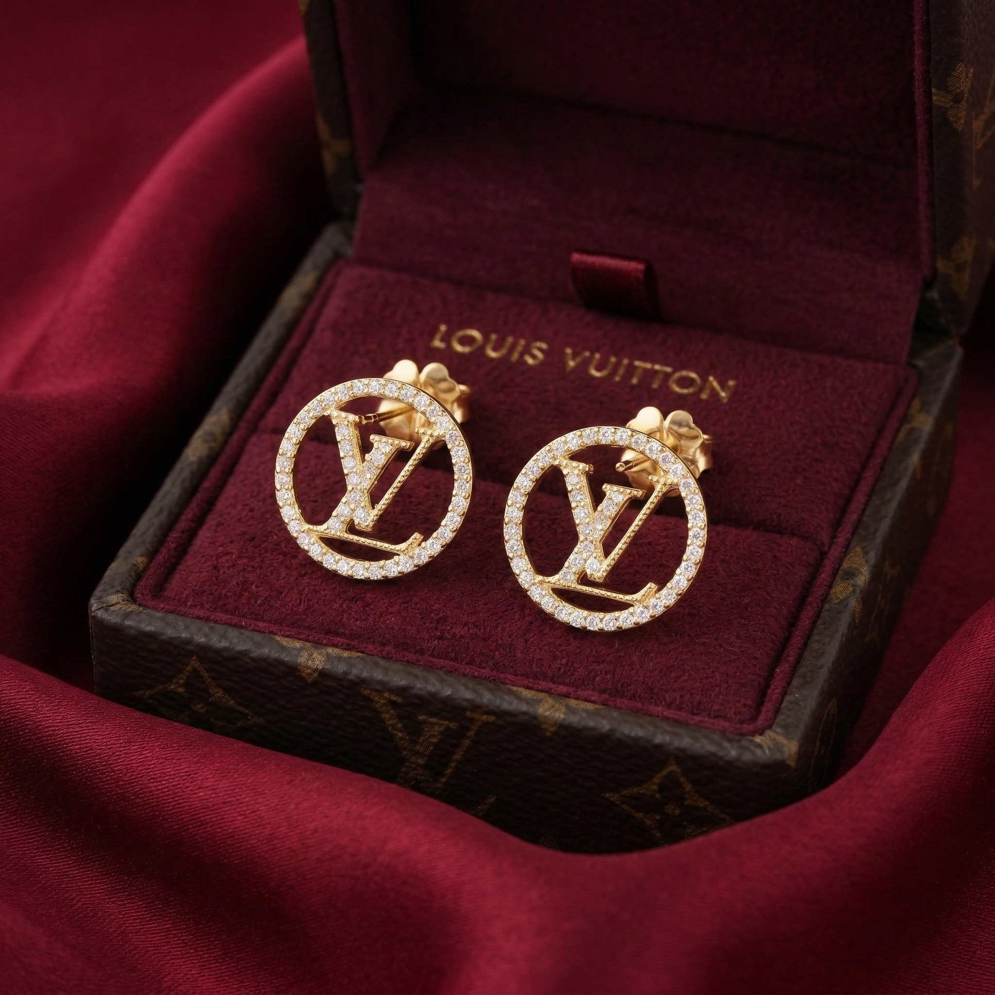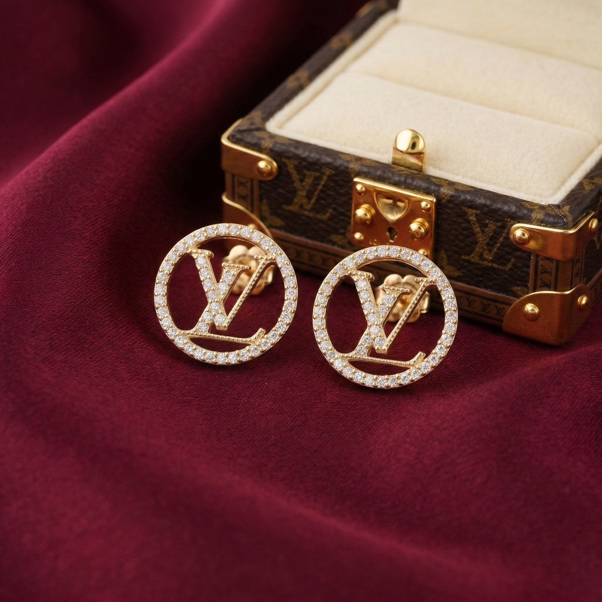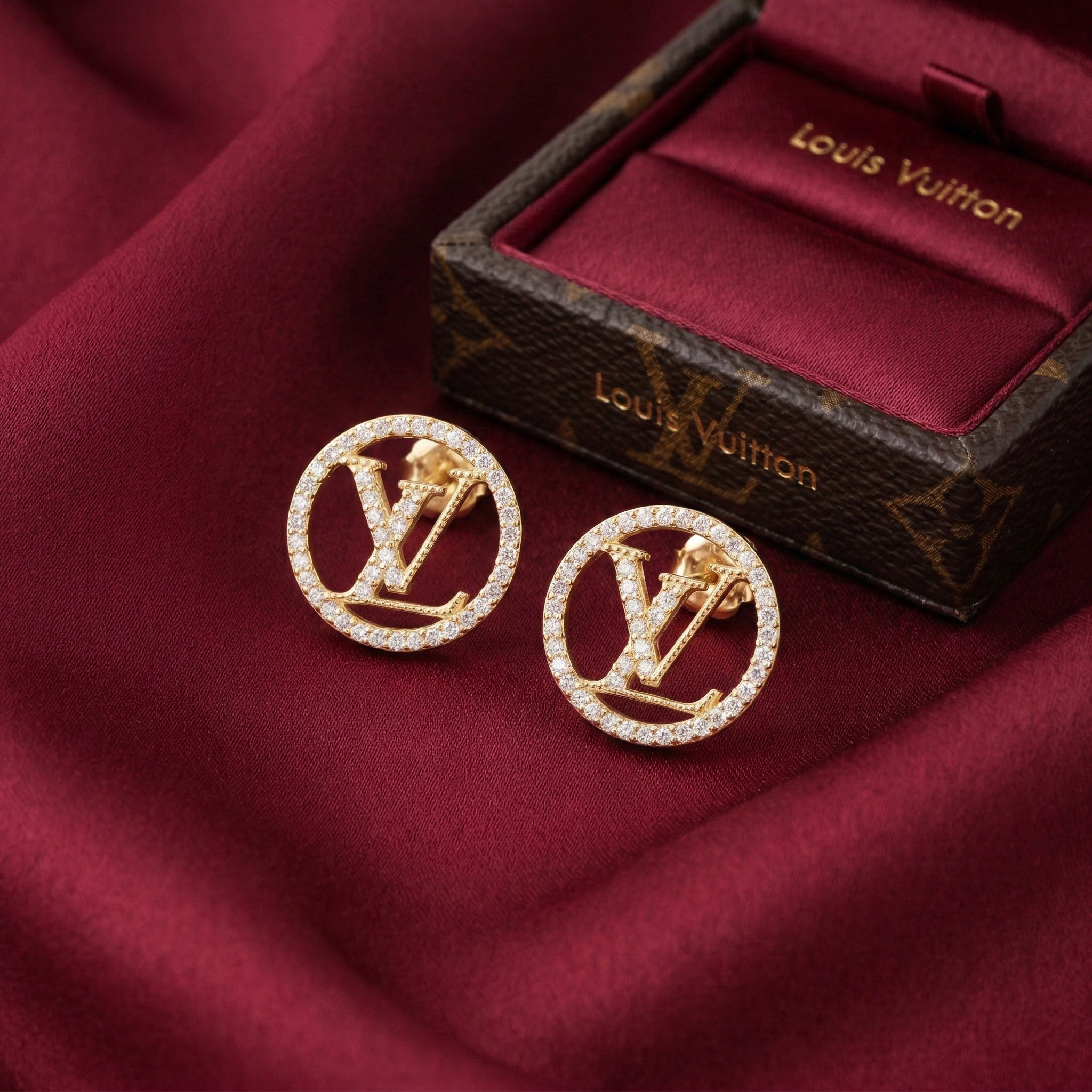 Inspired by the iconic L.V. emblem, these round stud earrings are a perfect blend of classic beauty and modern style. The prominent round design gracefully embraces the sparkling, stone-encrusted “L.V.” logo, delivering a luxurious and incredibly fashionable look.