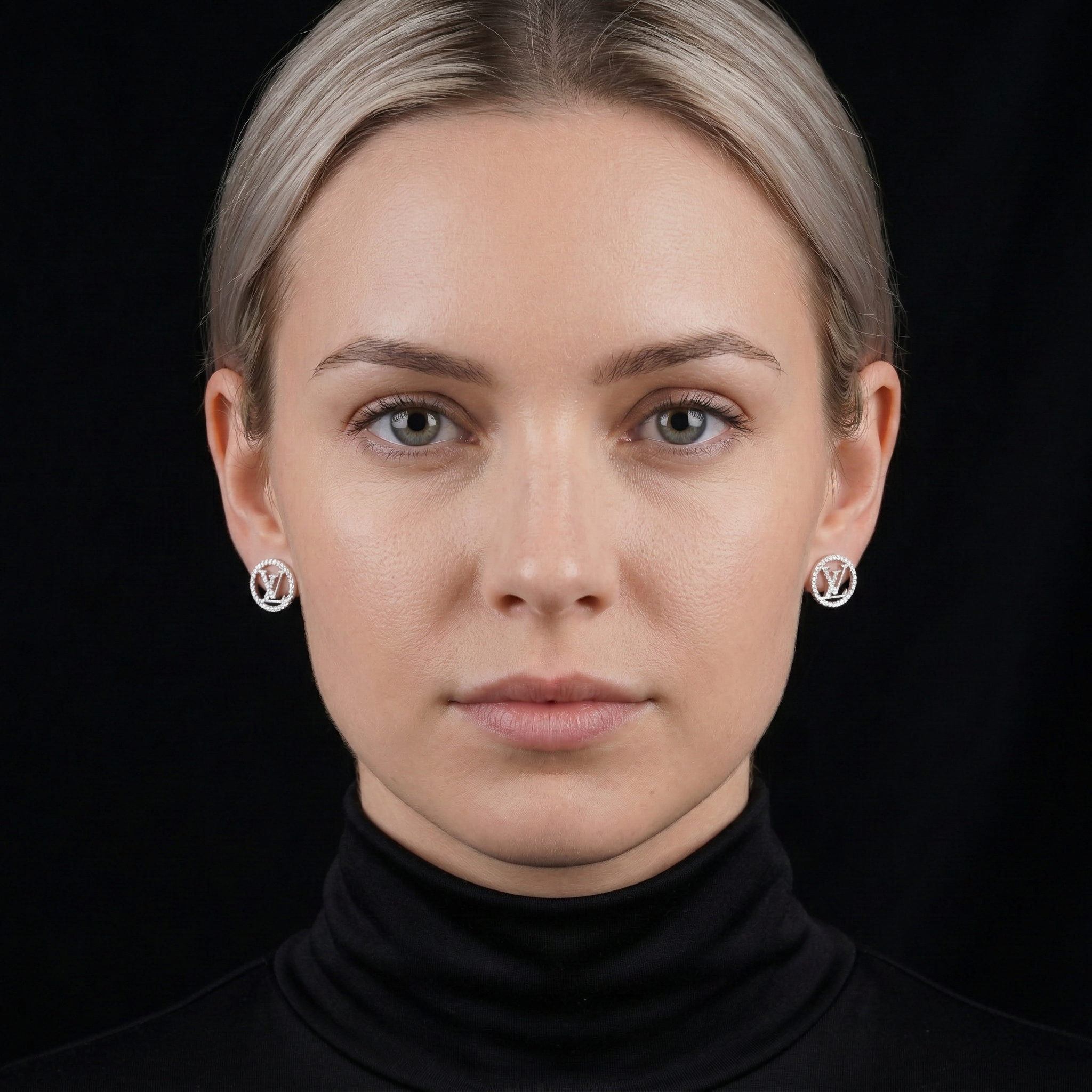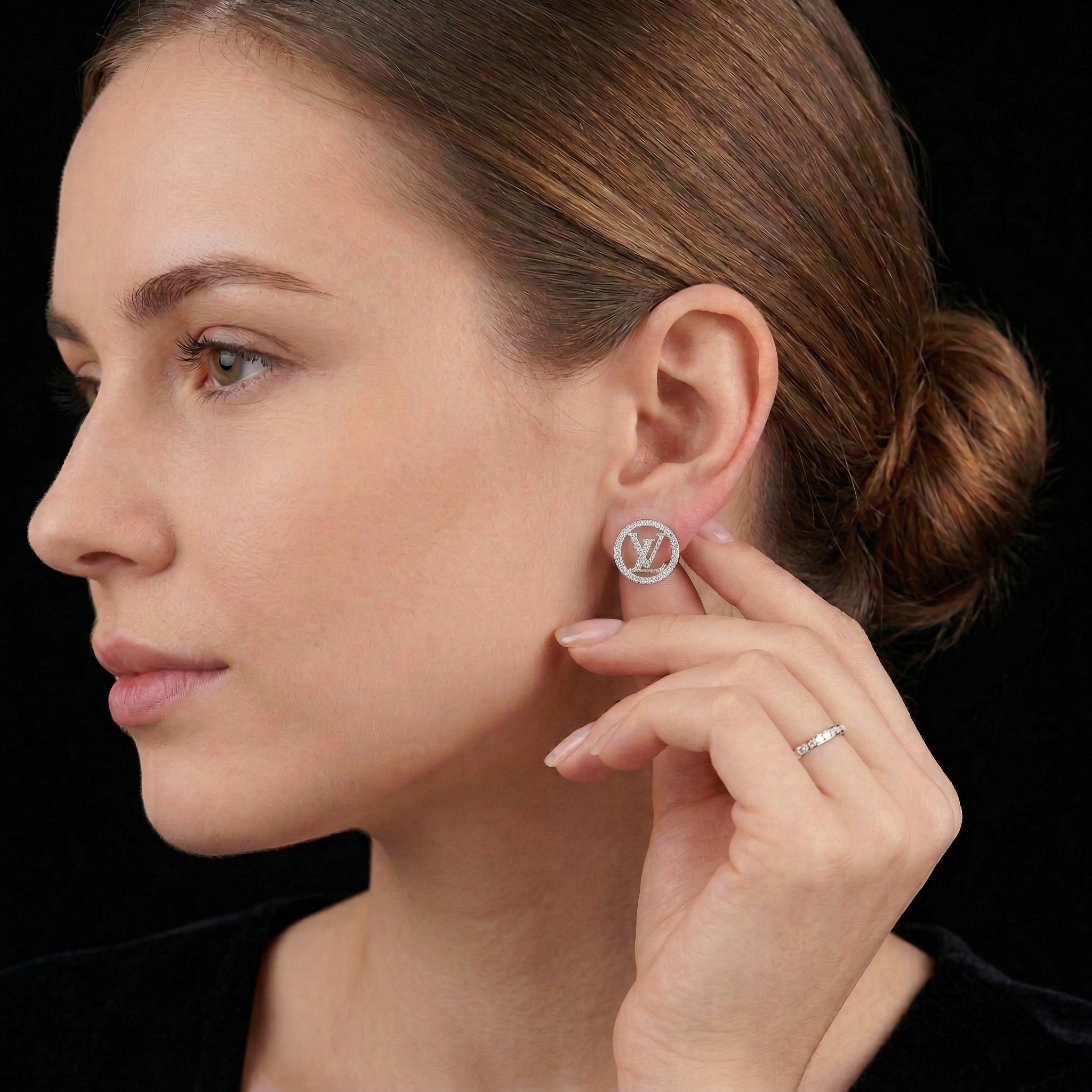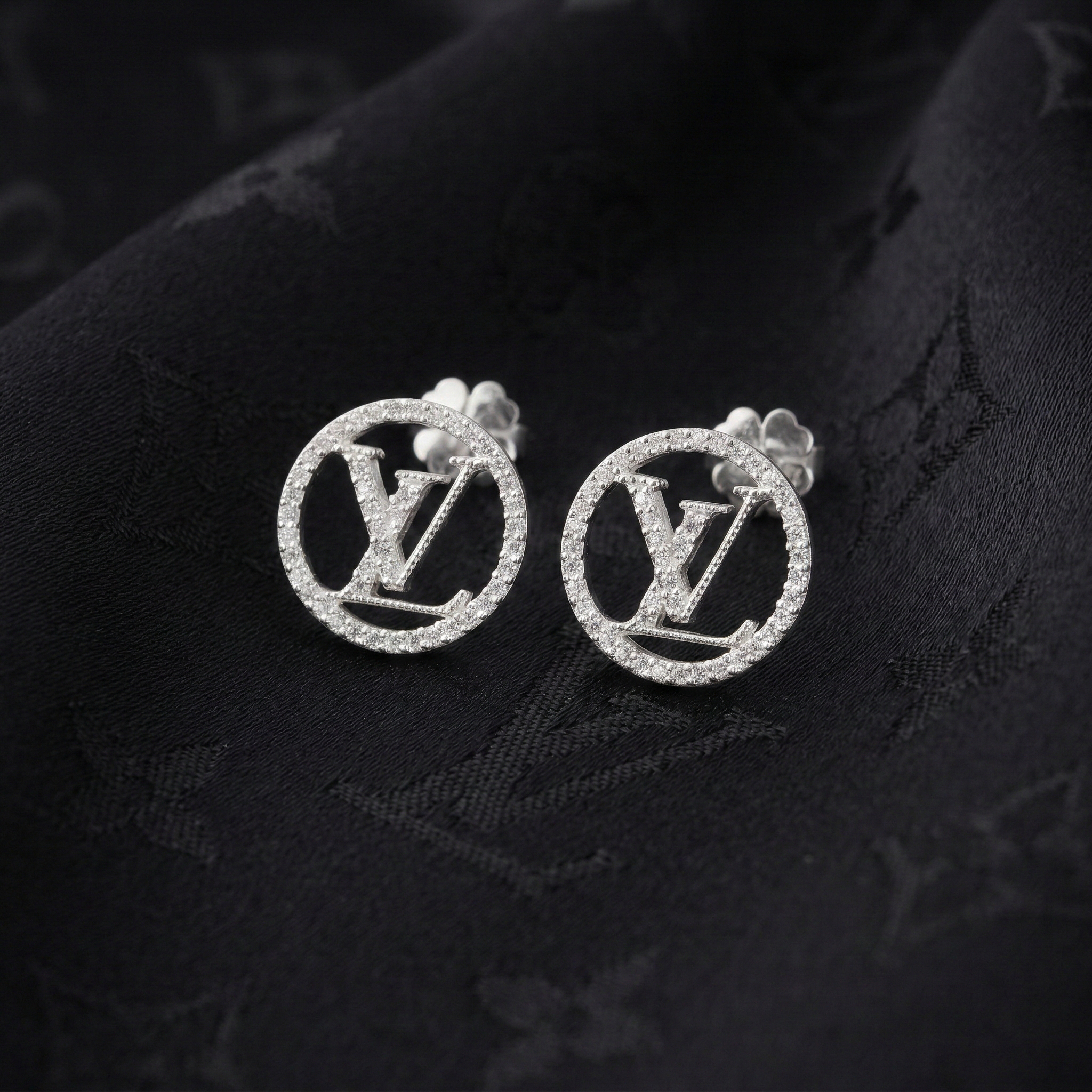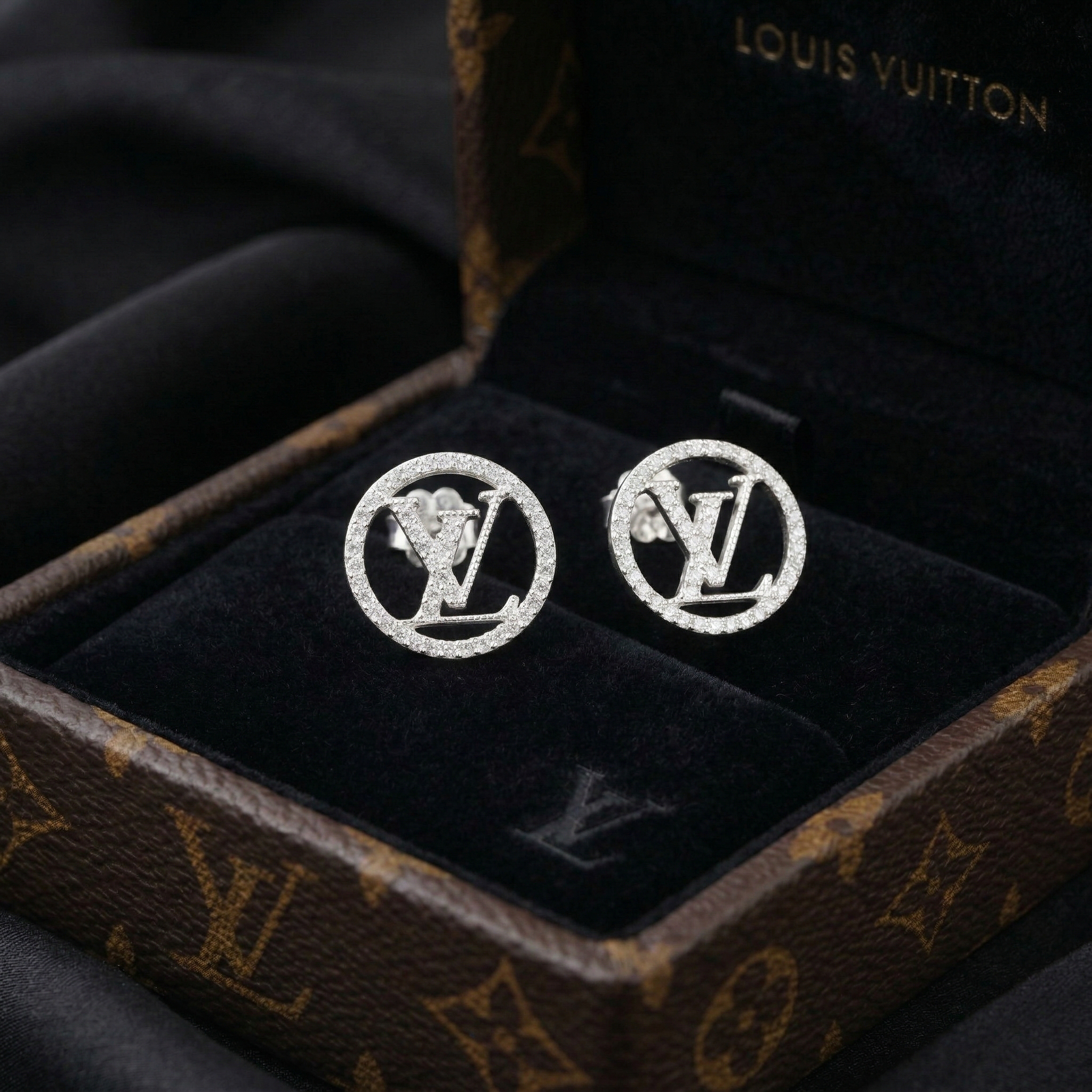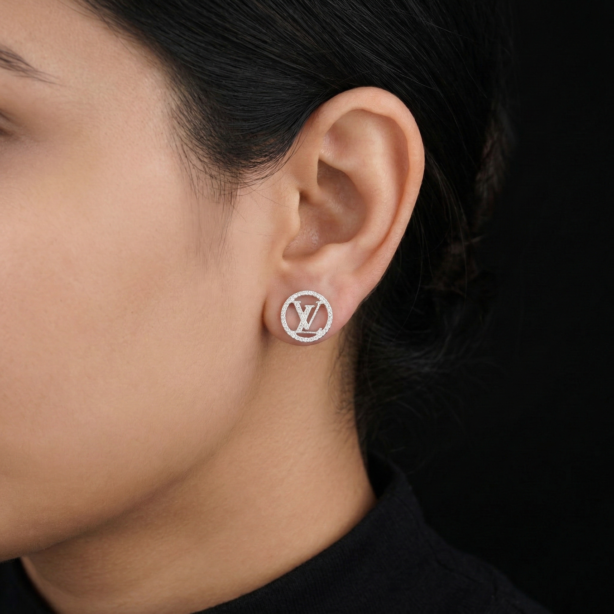 Inspired by the iconic L.V. emblem, these round stud earrings are a perfect blend of classic beauty and modern style. The prominent round design gracefully embraces the sparkling, stone-encrusted “L.V.” logo, delivering a luxurious and incredibly fashionable look.