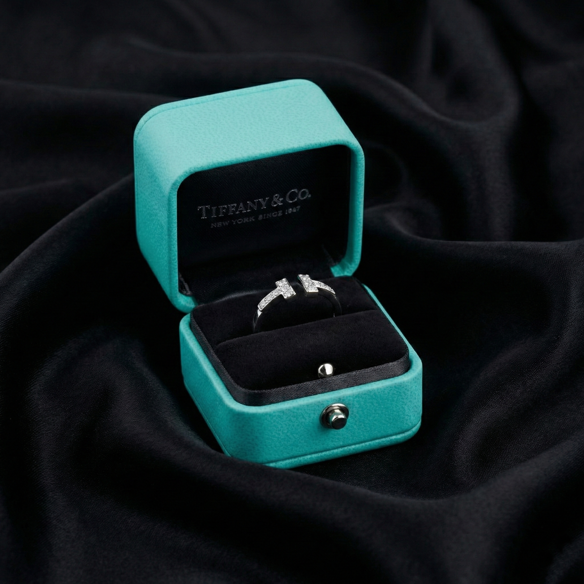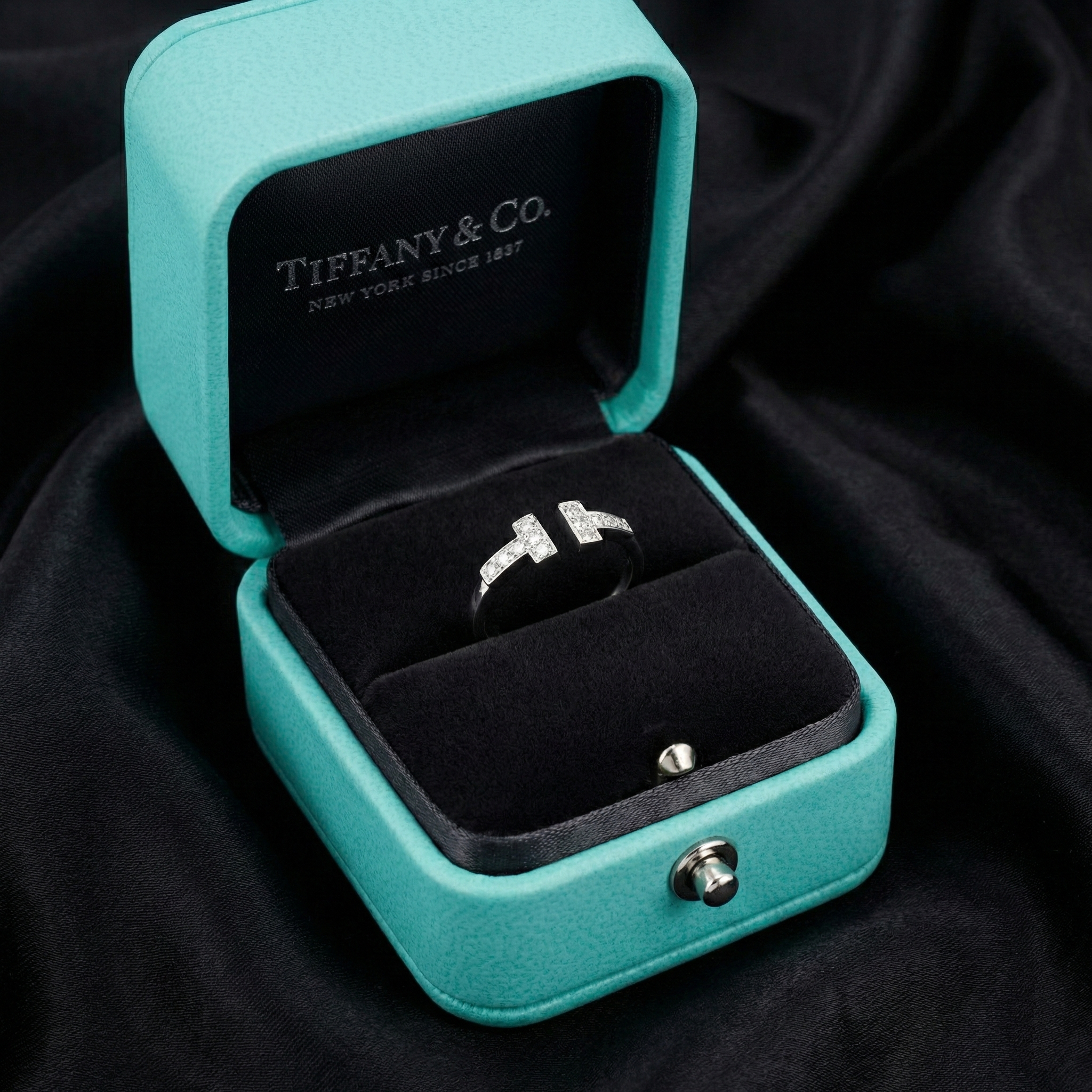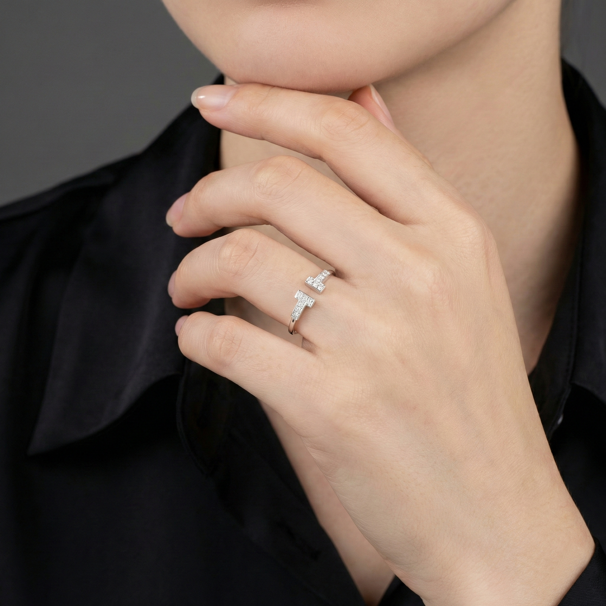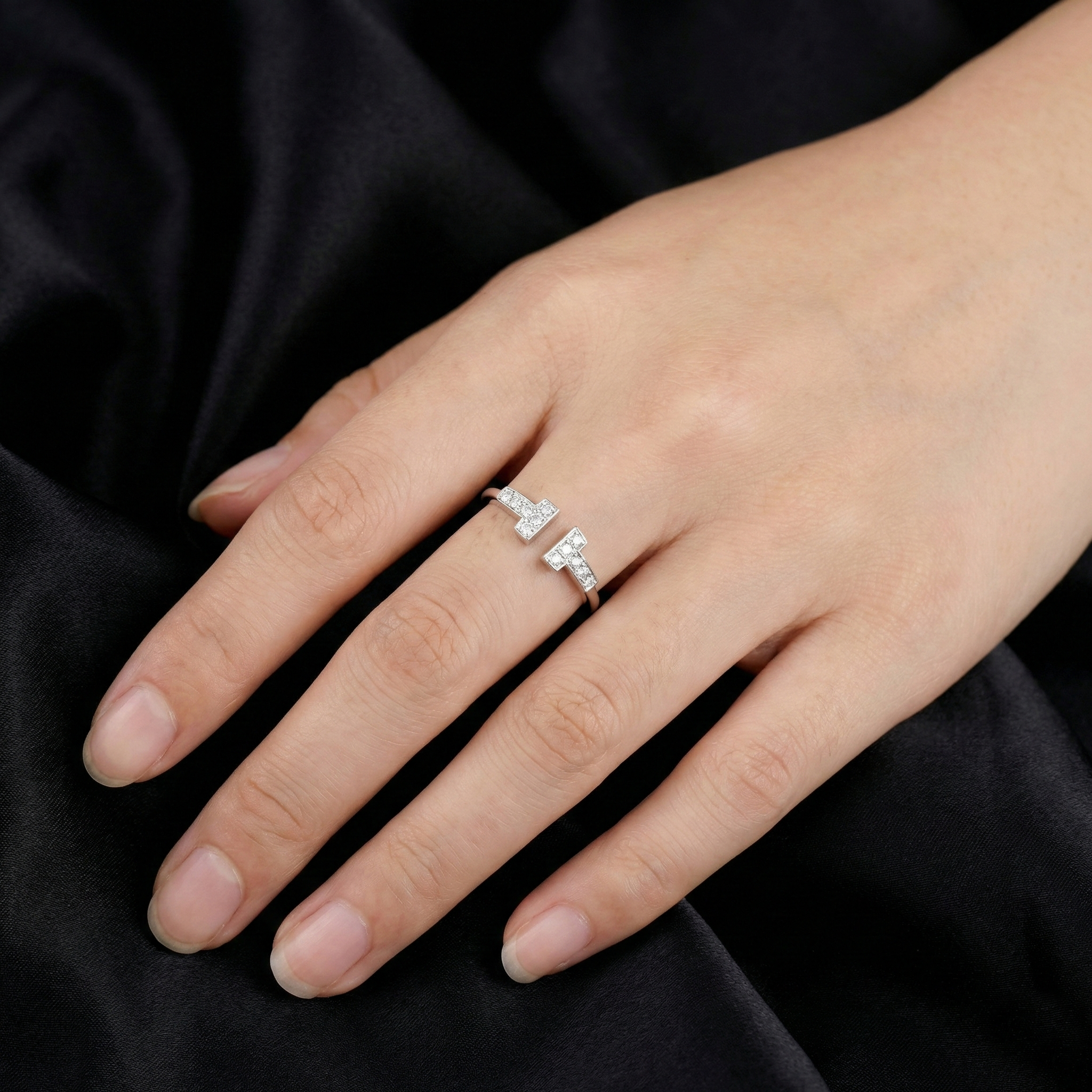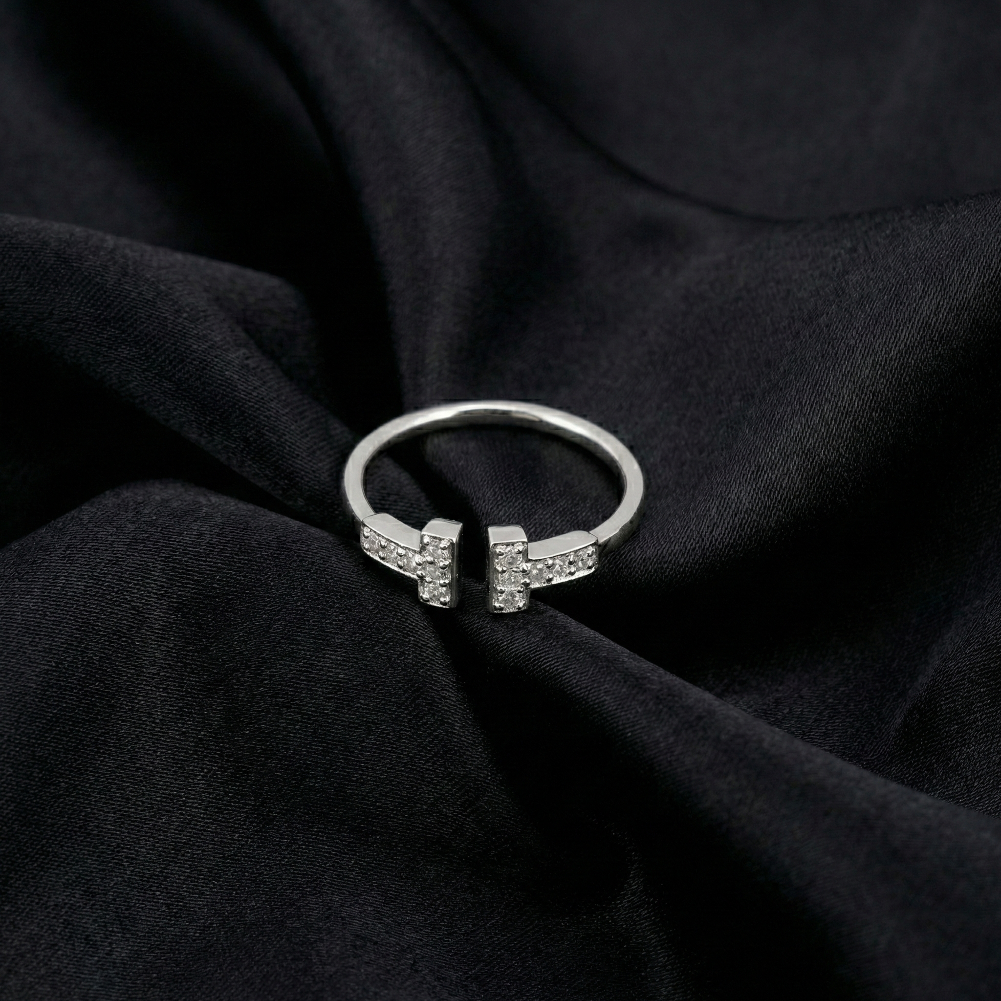 This exquisite ring showcases a distinctive “T” design, blending contemporary style with timeless sophistication. The dual “T” bars, adorned with sparkling cubic zirconia stones, create a radiant focal point on the slender band, offering a delicate yet undeniably luxurious aesthetic.