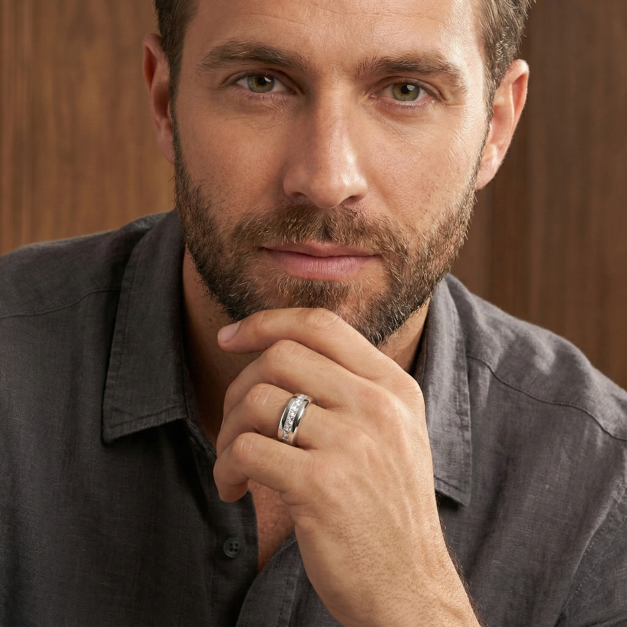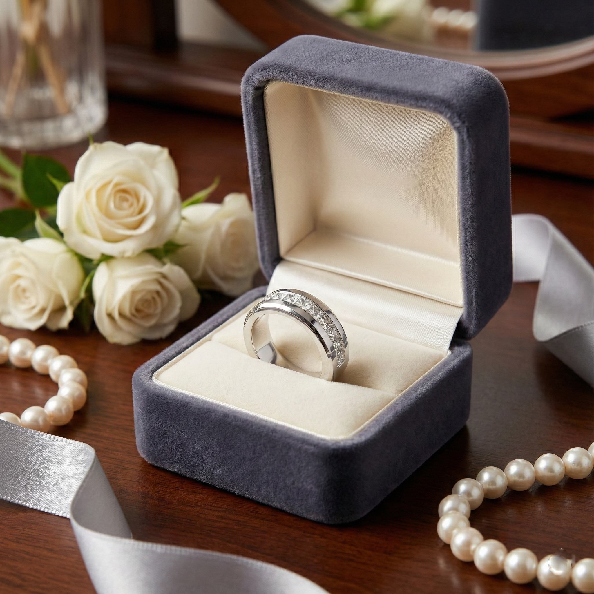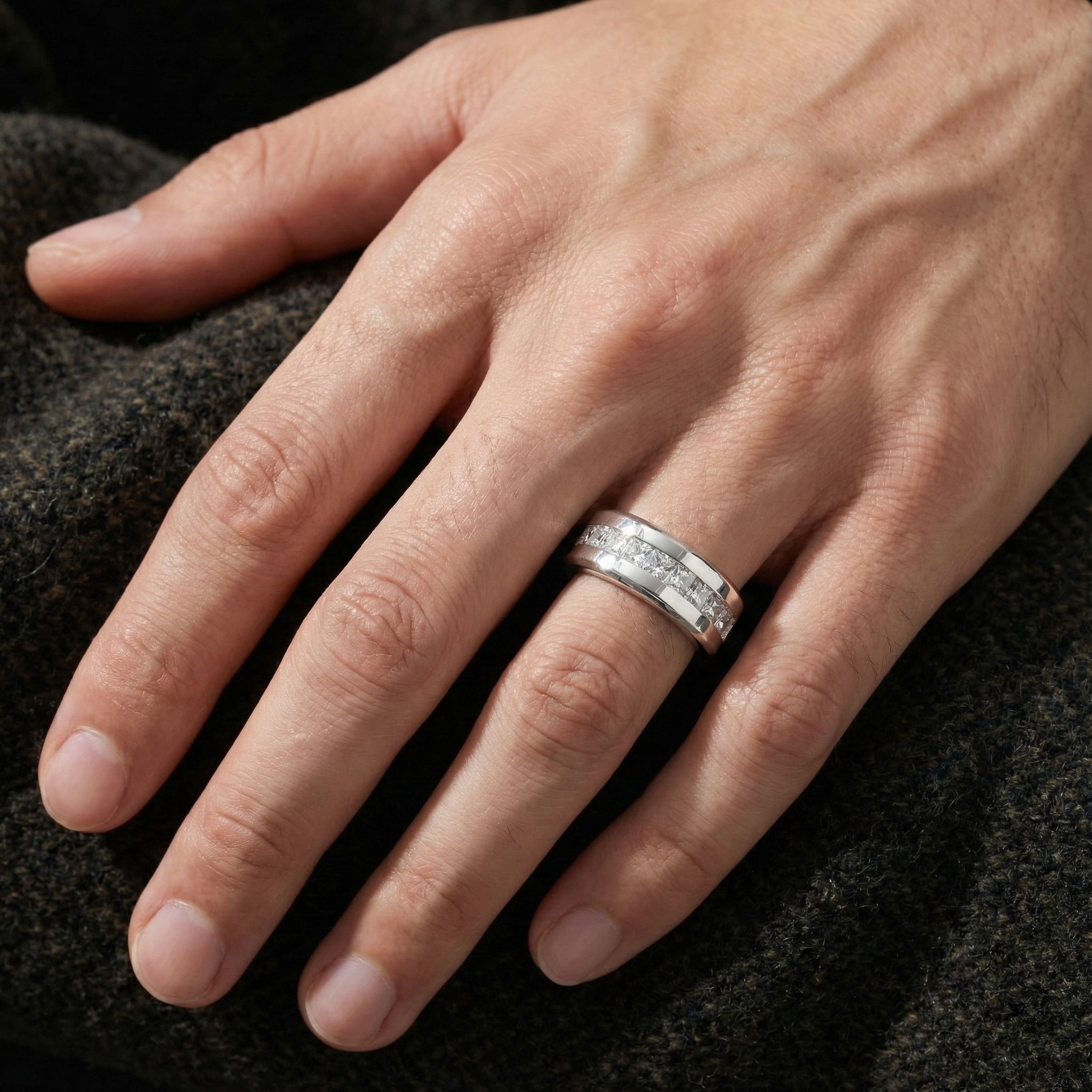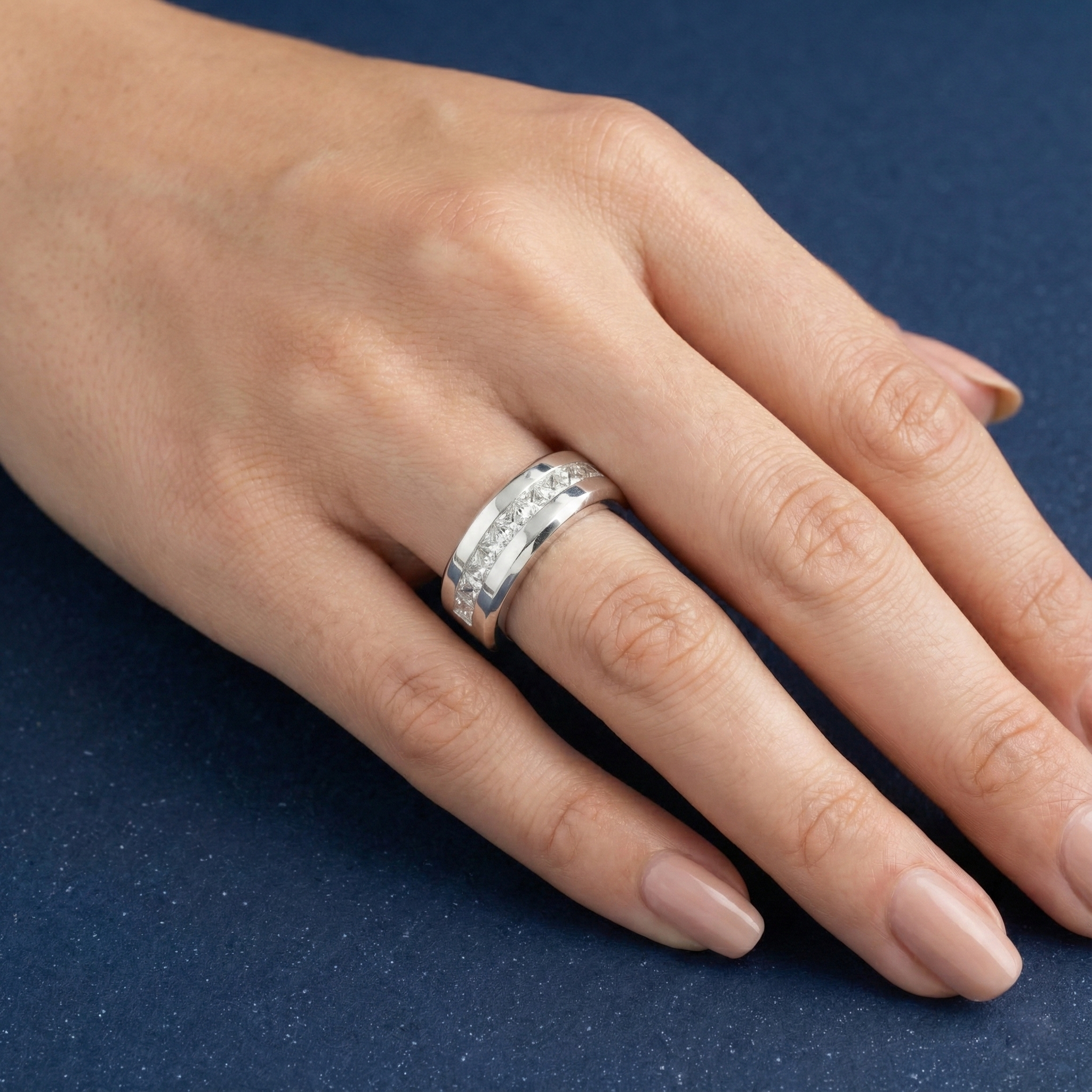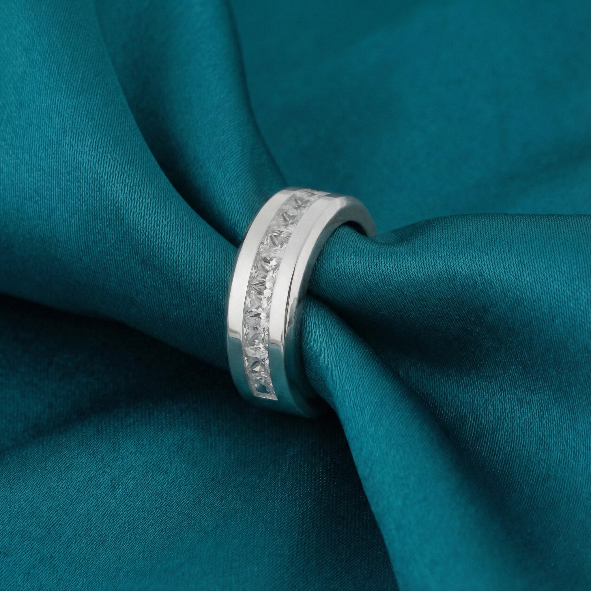 Band Ring with 9 Large Princess Cut Cubic Zirconia: A Statement of Enduring Style. This Band Ring is truly striking, featuring nine princess-cut cubic zirconia stones that make a powerful impression. Its design is versatile, suitable for both men and women, blending a bold aesthetic with refined elegance.