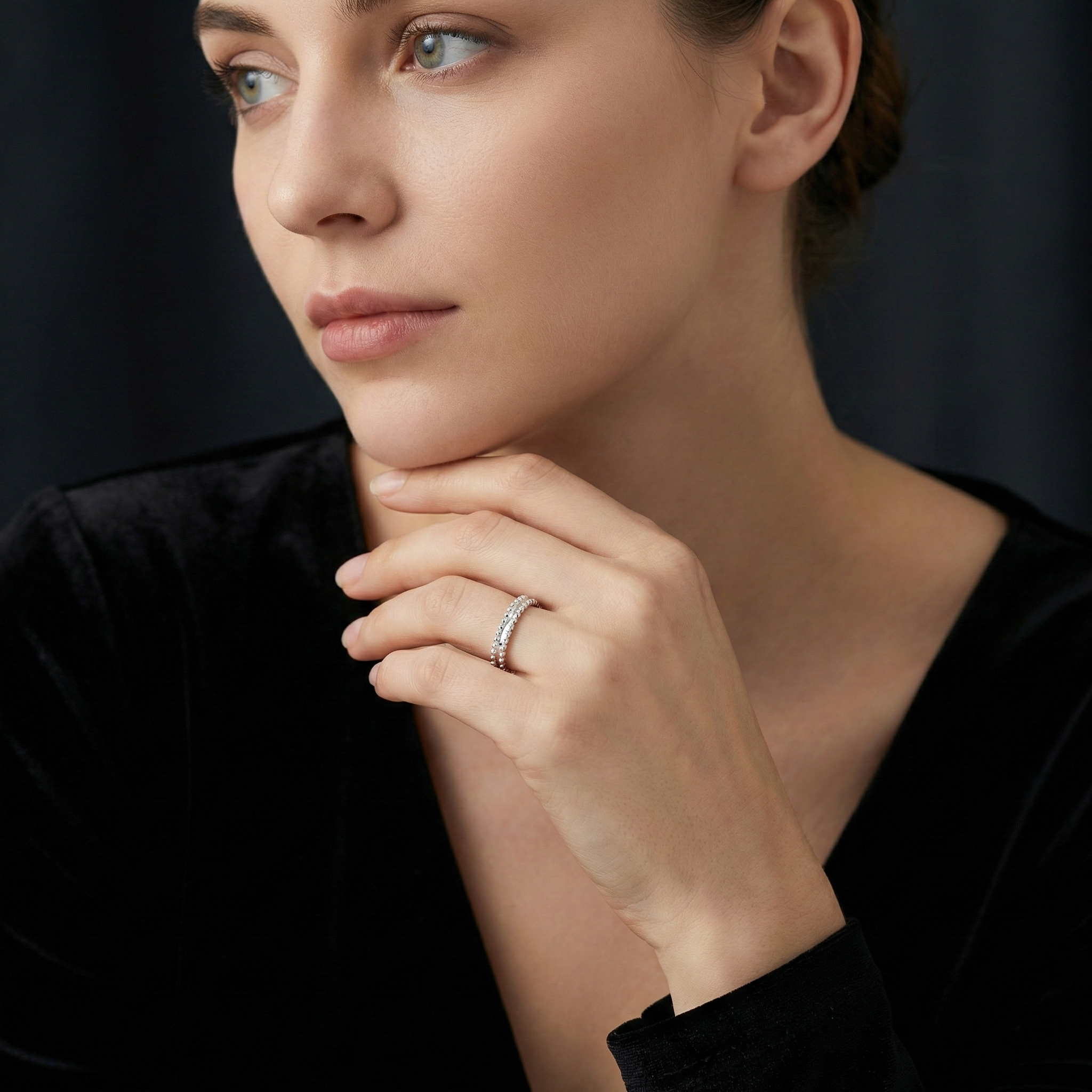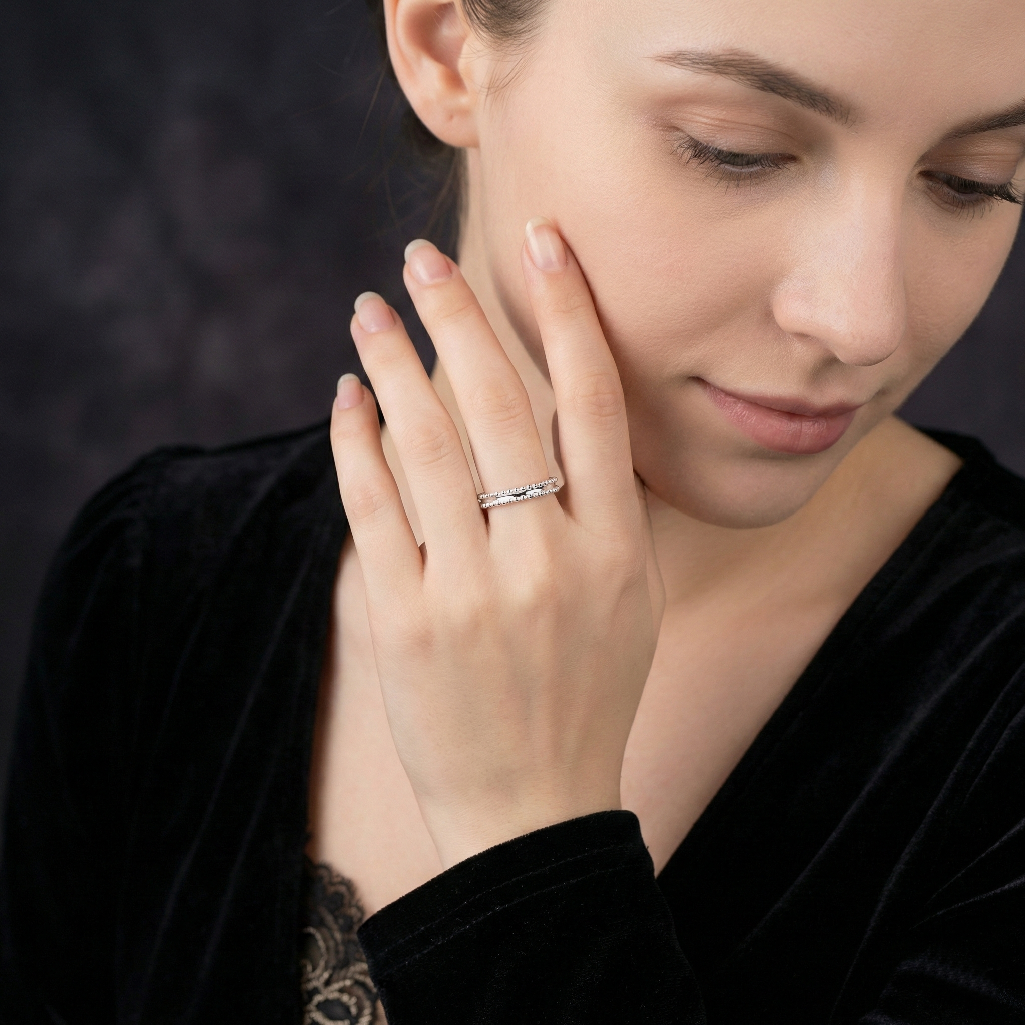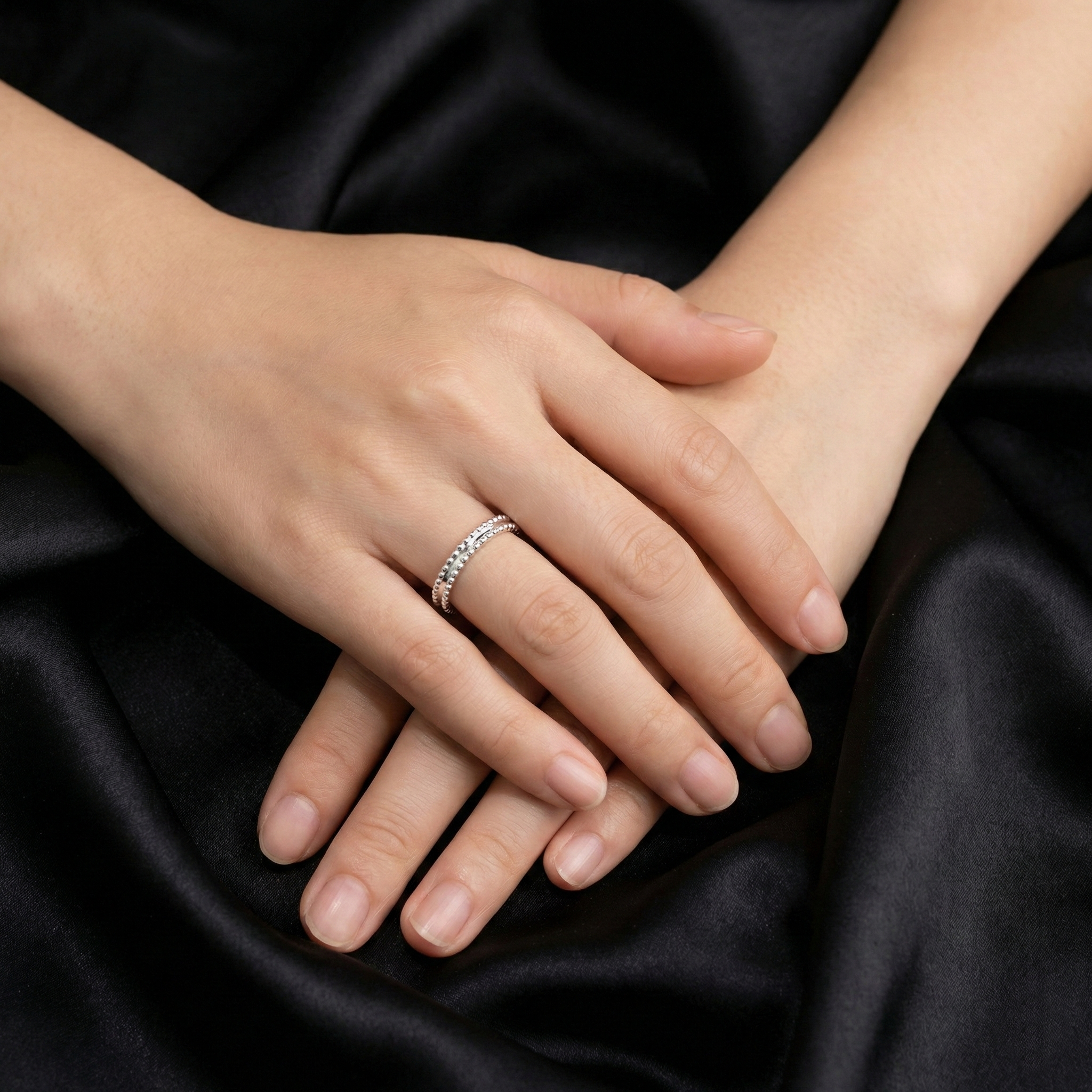 Sleek and slender (3mm width), its minimalist silhouette belies a powerful versatility. Whether worn solo for effortless everyday elegance or stacked with engagement rings for bridal brilliance, it adapts seamlessly to every moment.