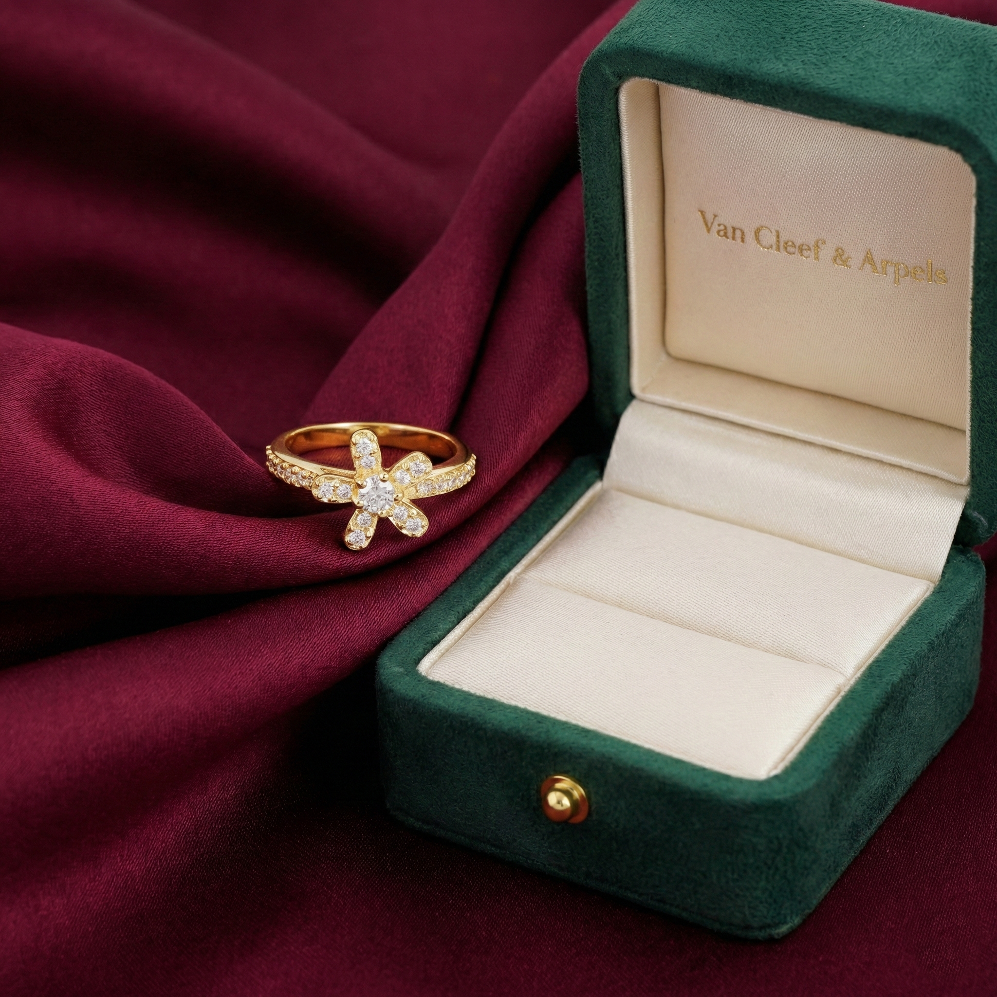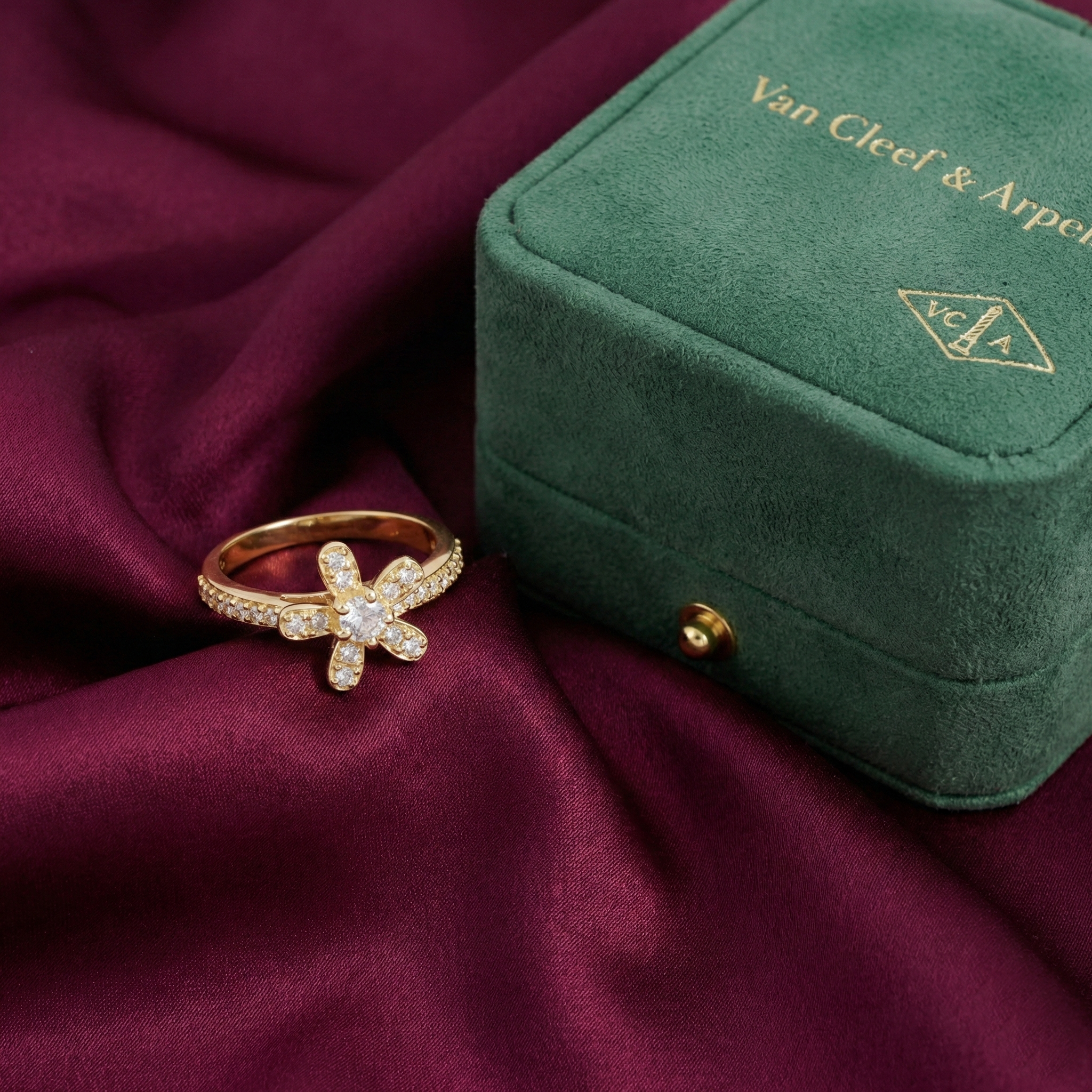 The Socratic Ring, 1 Flower is an exceptional design from Van Cleef & Arpels, featuring 18k gold plating and 26 dazzling diamonds meticulously set across its surface, creating a truly breathtaking aesthetic.