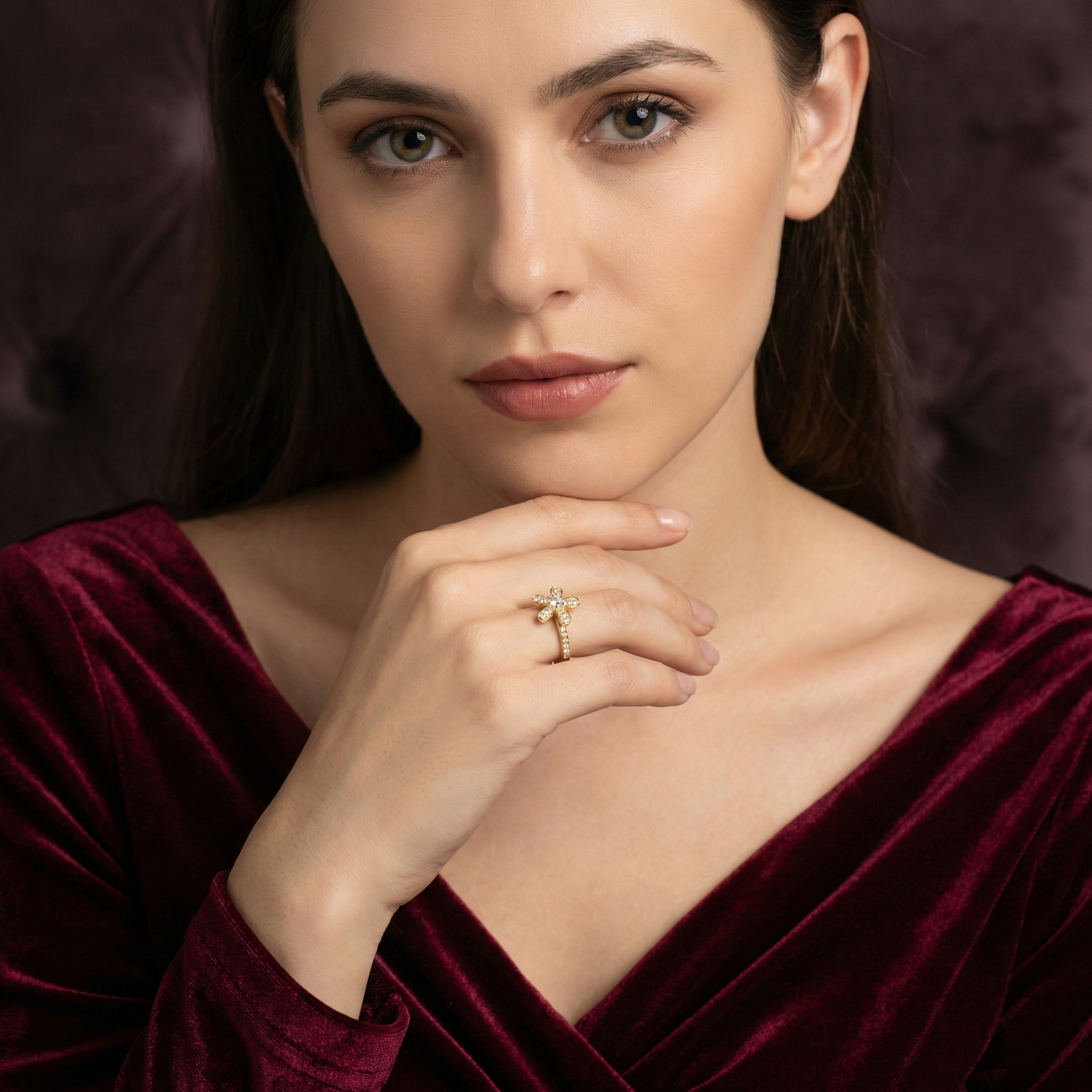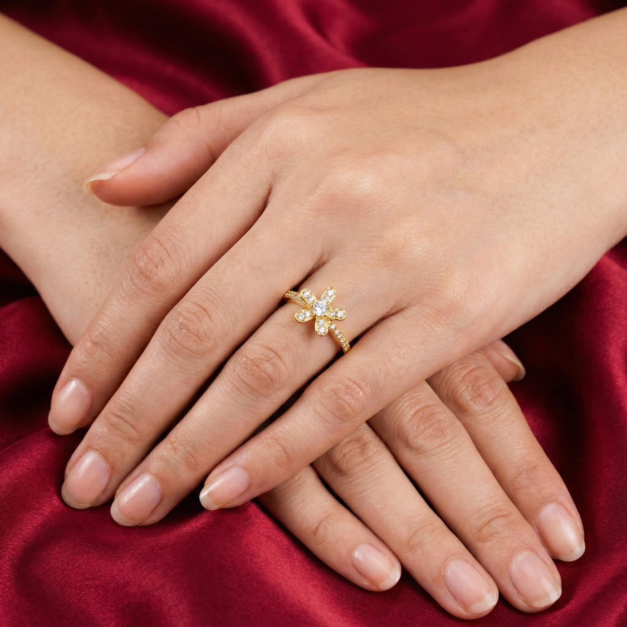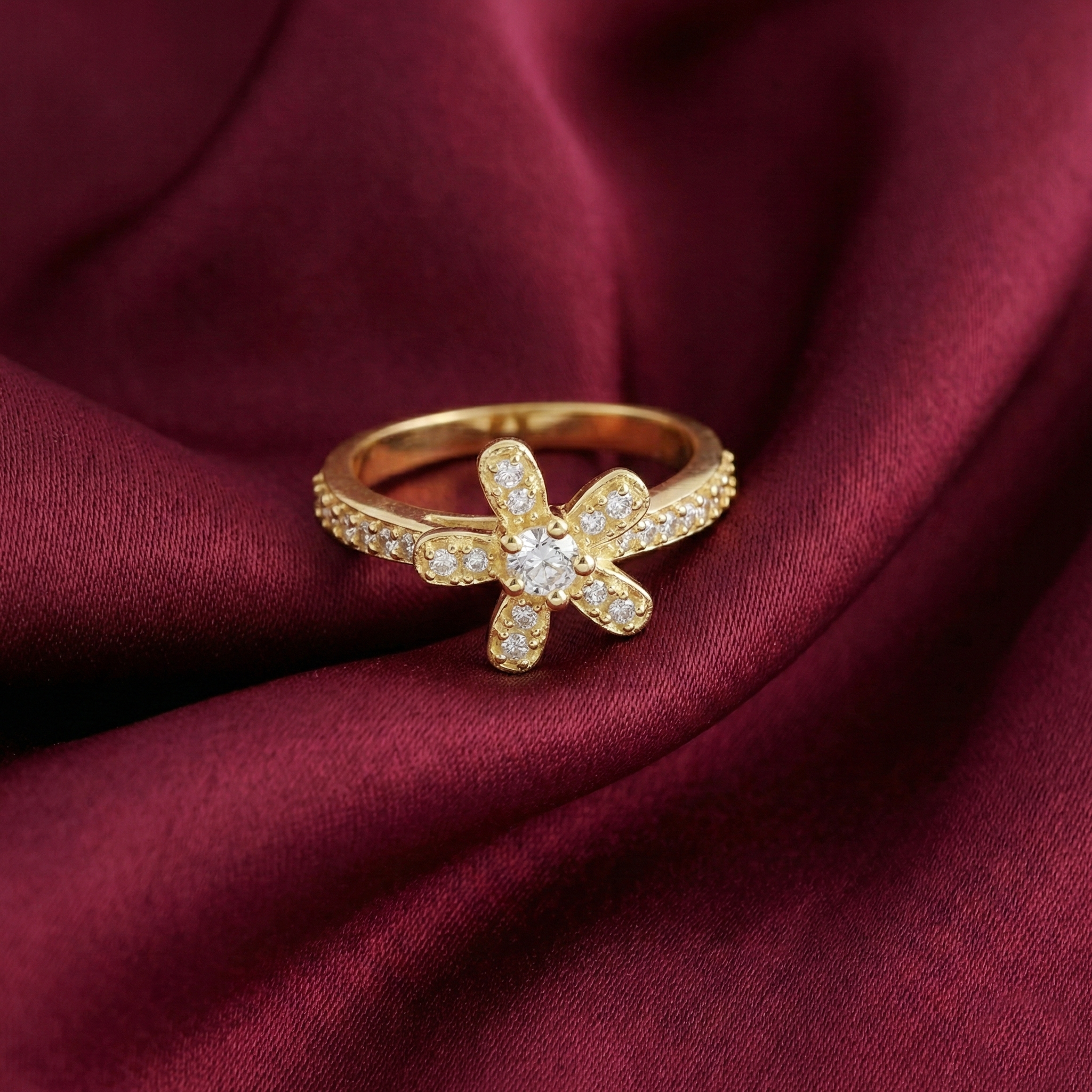 The ring?s centerpiece is a full-pav? floral motif, designed to shimmer brilliantly under light?like a flower in full bloom under the sun. Wearing this ring evokes a sense of freshness and delicate grace. Its slender band, adorned with a continuous line of accent stones, ensures a comfortable and secure fit, making it perfect for daily wear or as a statement piece for special occasions.